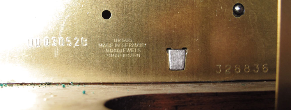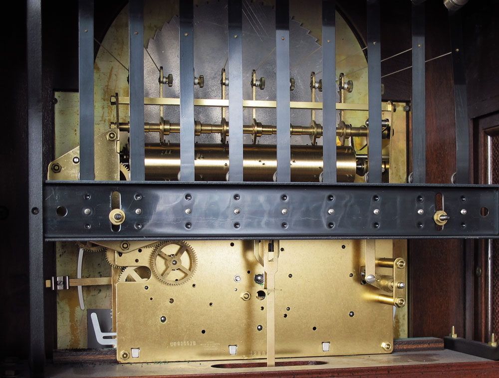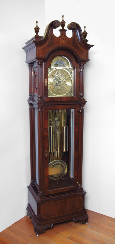 SLIGH 9 TUBE CENTENNIAL GRANDFATHER CLOCK: Swan neck pediment with 3 urn finials, inlaid decoration, and mixed metal dial with moon phase. Triple weight movement with 9 tube triple chime. Fluted columns on bonnet and body, beveled glass. Serial number 1548, engraved owners nameplate inside. Keys in office. Measures 92'' x 26'' x 17 1/4''.