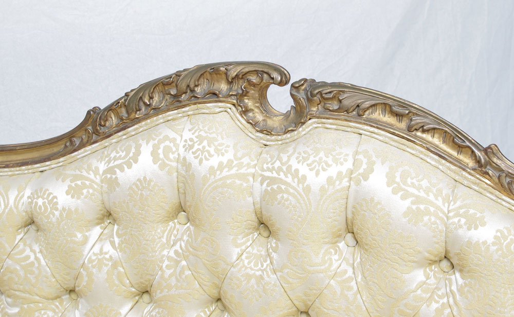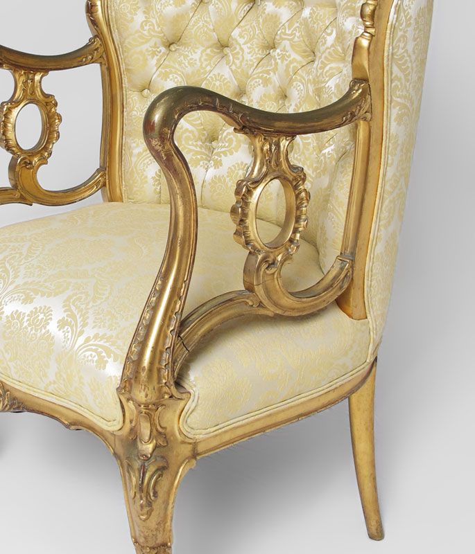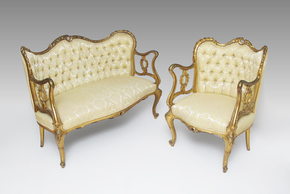 LOUIS XV STYLE GOLD GILT SETTEE AND GENTLEMAN'S CHAIR: 19th century, with carved and shaped top rail, arms and supports. Carved and shaped skirts and front legs. Foliate pattern tufted upholstery. Settee measures 36'' h. x 49'' x 27'', chair 36'' x 25 1/4'' x 25 1/2''.