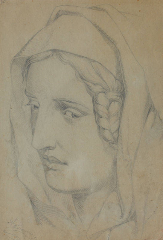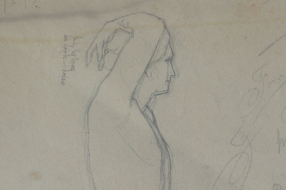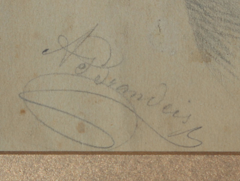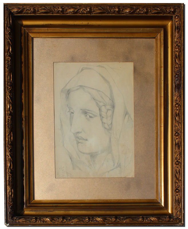 GOOD PENCIL DRAWING PORTRAIT OF A WOMAN, SIGNED BRANDEIS: 14'' x 10'', study sketches verso with Brandeis signature, 19th Century, gilded gesso frame with wear, 26'' x 20 1/2''.
