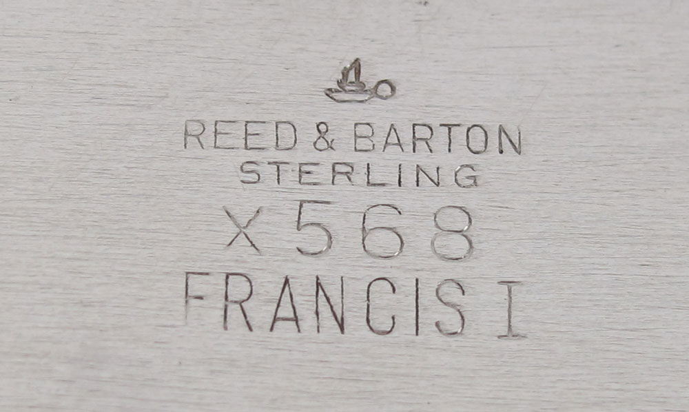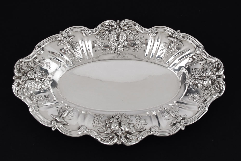 REED & BARTON FRANCIS I STERLING BREAD TRAY: Embossed foliate and fruit motif rim, marked on base with 1955 date mark, Reed & Barton, Sterling, X568, FRANCIS I. 1 3/4'' x 11 3/4'' x 7 1/2''. Approx. 13.7 troy oz.