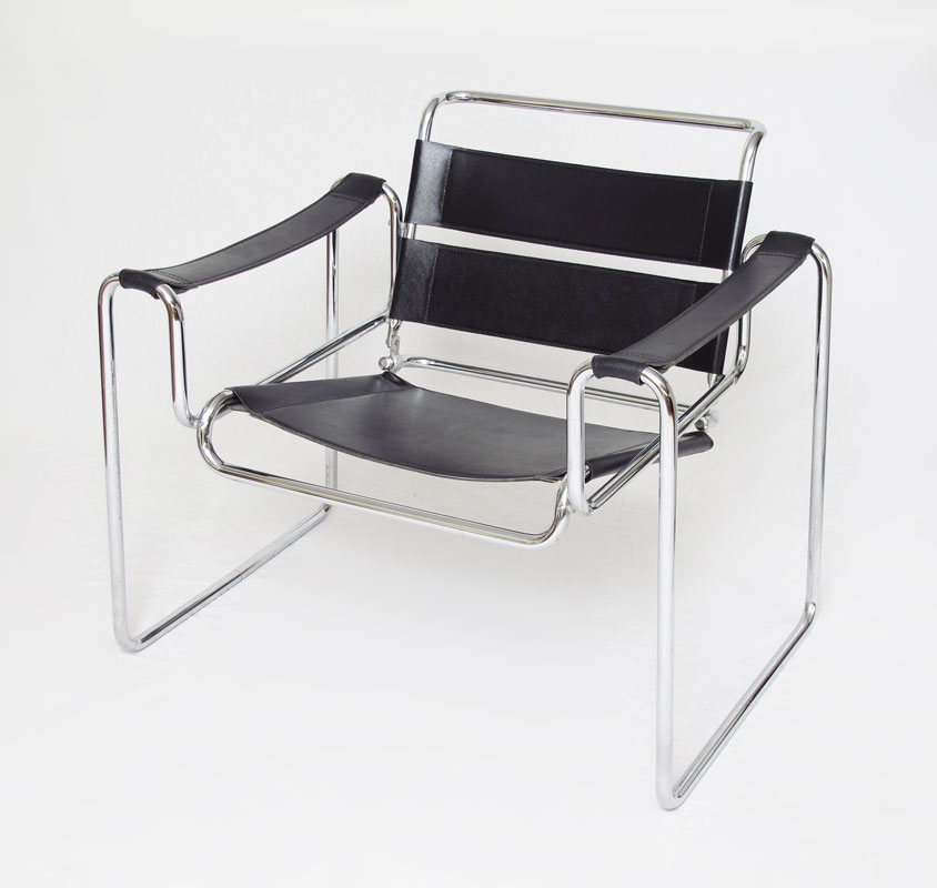 WASSILY CHAIR DESIGNED BY MARCEL BREUER: Black metal tube construction with black leather supports. 30'' h. x 30 1/4'' x 28''.