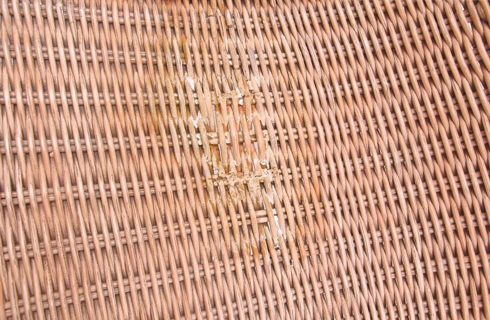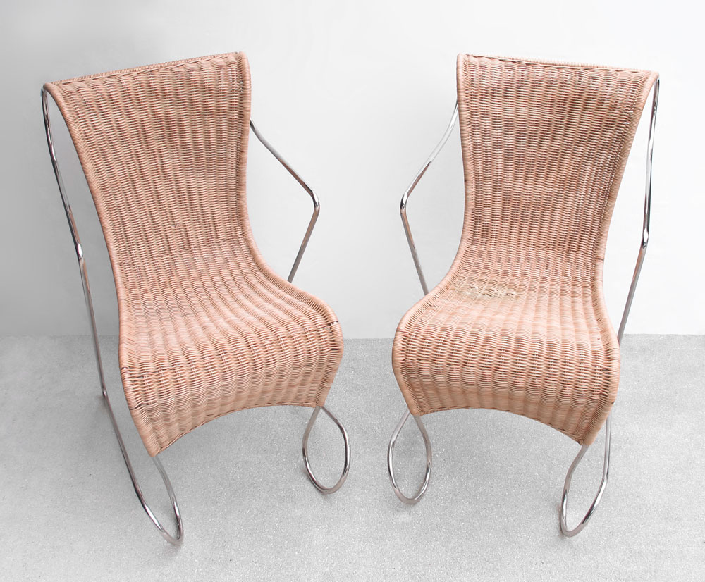 A PAIR OF RON ARAD ZIGO EASY CHAIRS: Manufactured by Driade. Stackable chairs of polished stainless steel with natural rattan. One seat does have repair to the weave.