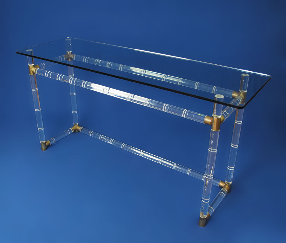CHARLES HOLLIS JONES SOFA TABLE: Lucite and brass frame with glass top. 29'' h. x 56'' x 18''.
