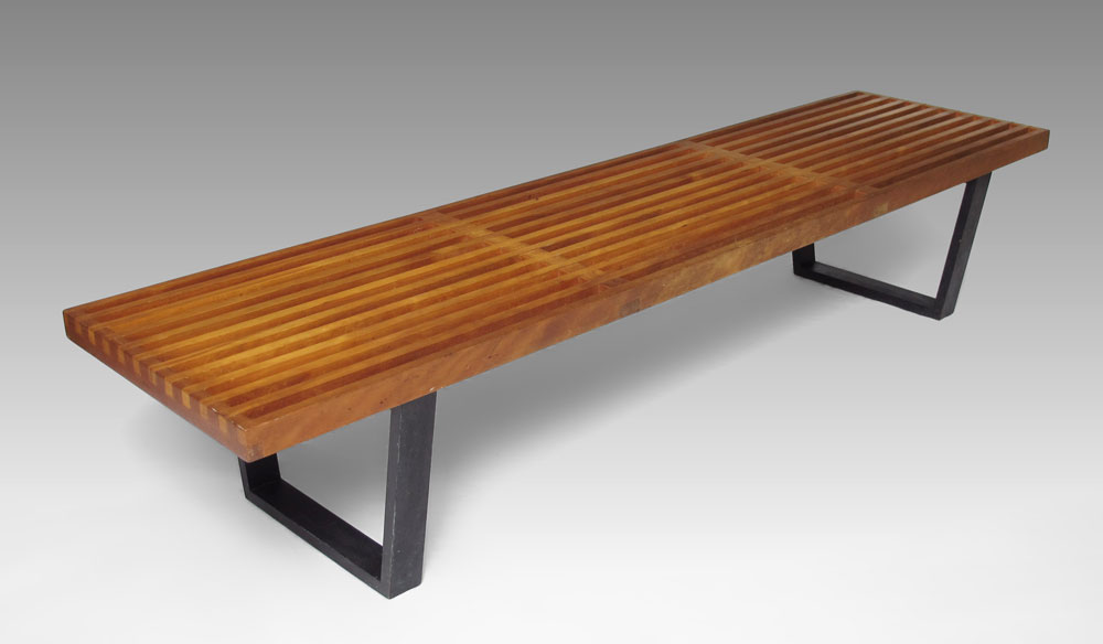 GEORGE NELSON / HERMAN MILLER PLATFORM BENCH: Slat top, maple with ebonized legs. Marked with metal tag. 14'' h. x 72 1/4'' x 18 1/2''.