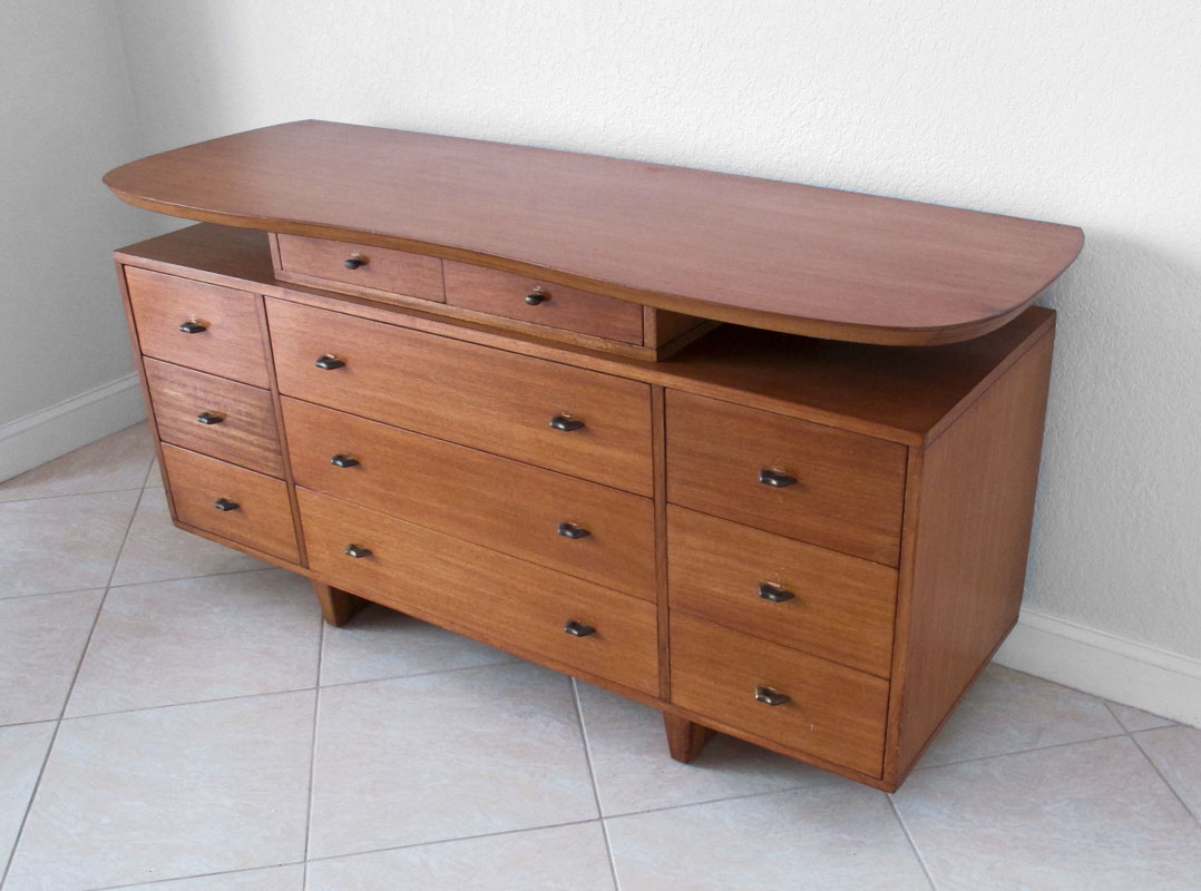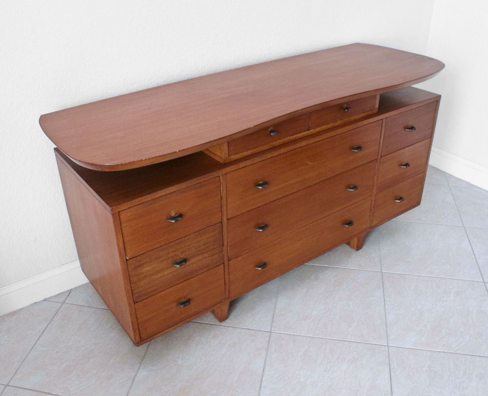 MID CENTURY TEAK SIDEBOARD/ DRESSER/ BUFFET: The oval top floats over 11 drawers, metal pulls. Approx. 70'' long x 33 1/2'' tall x 23''. Used condition.