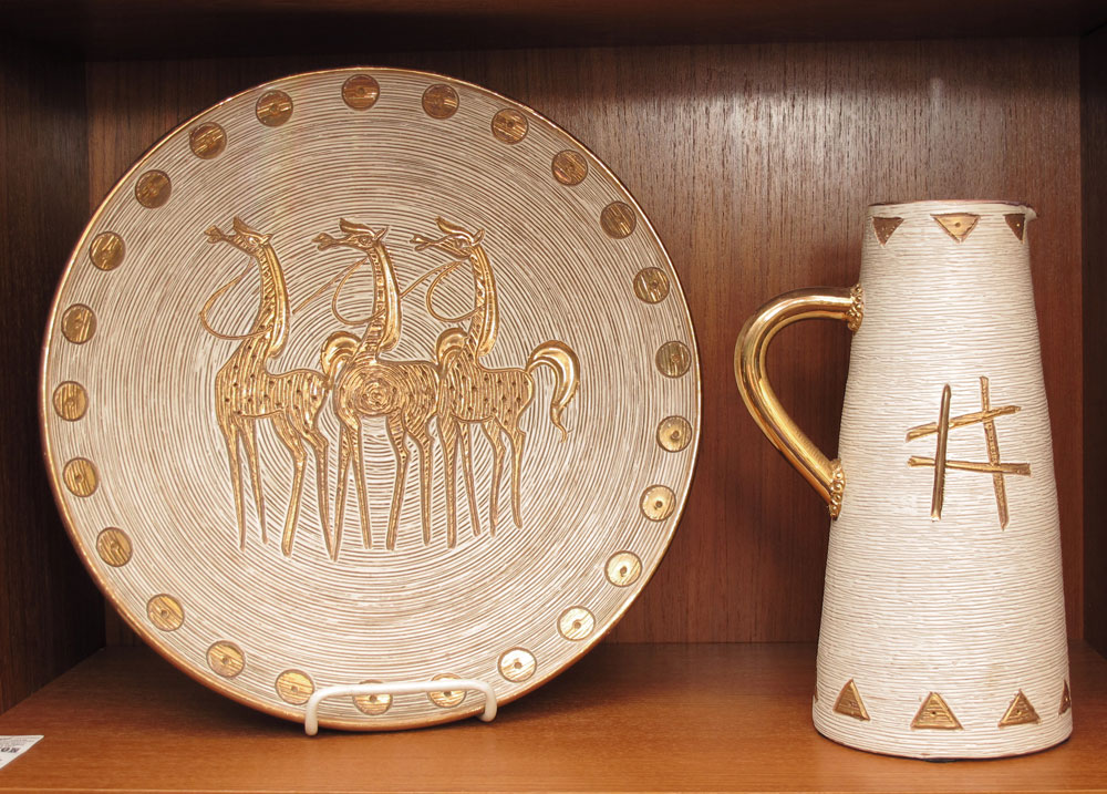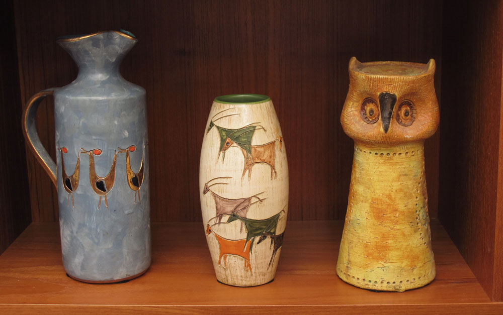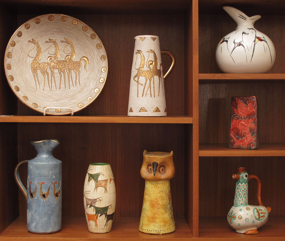 8 PIECE GROUP ITALIAN CERAMICS: To include 1) Rosenthal-Nette figural owl, 10'' h. 2) Seagull vase with figure birds, 6 1/4'' h. 3) Elbee pitcher with figural roosters, 11 1/4'' h. 4) Pitcher with figural horses, 8 1/4'' h. 5) Vase with figural antelope, 8 1/4'' h. 6) Figural duck pitcher, 8'' h. 7) Elbee pitcher with horses, 9 3/4''. 8) Elbee plate with horses, 12 1/2'' dia.
