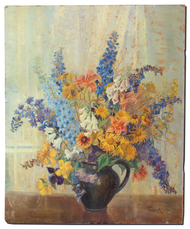 HAWLITZEK, Hedda (Ukrainian, 1945-1974): Floral Still Life, ''Sommerstrauss'', Oil/Board, 35 3/8'' x 28 3/4'', unframed, signed and titled verso, signed lower right.