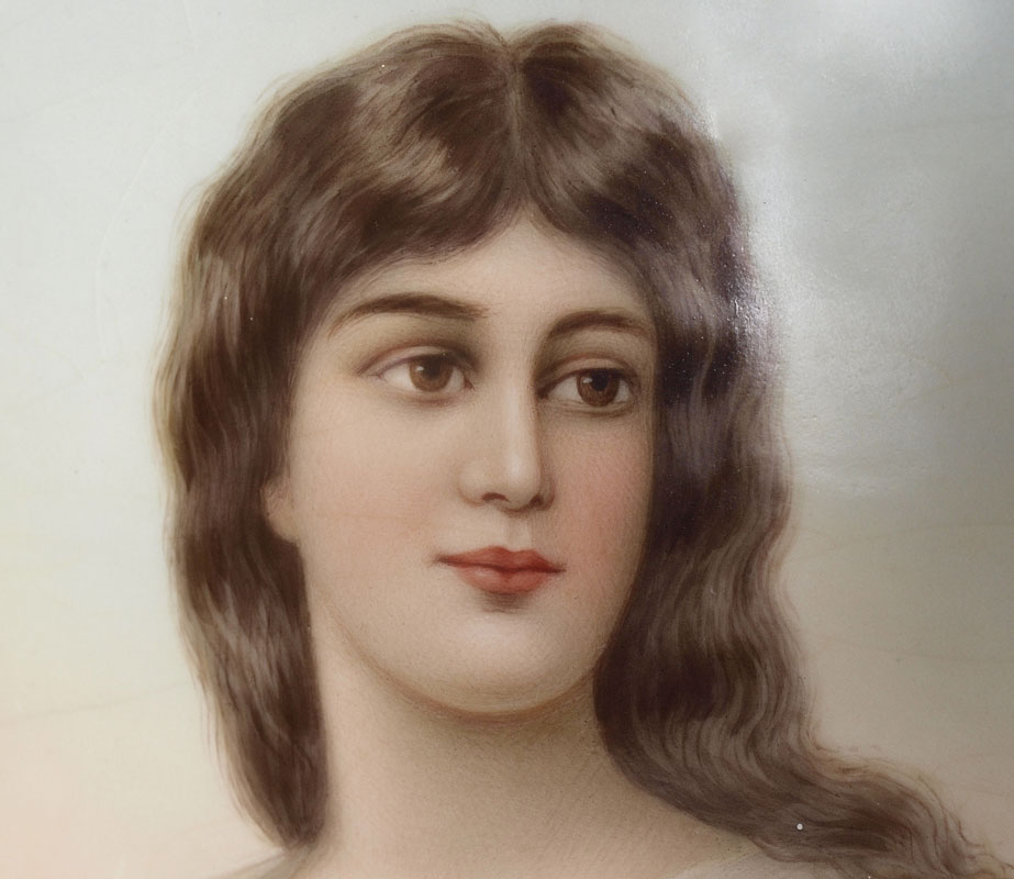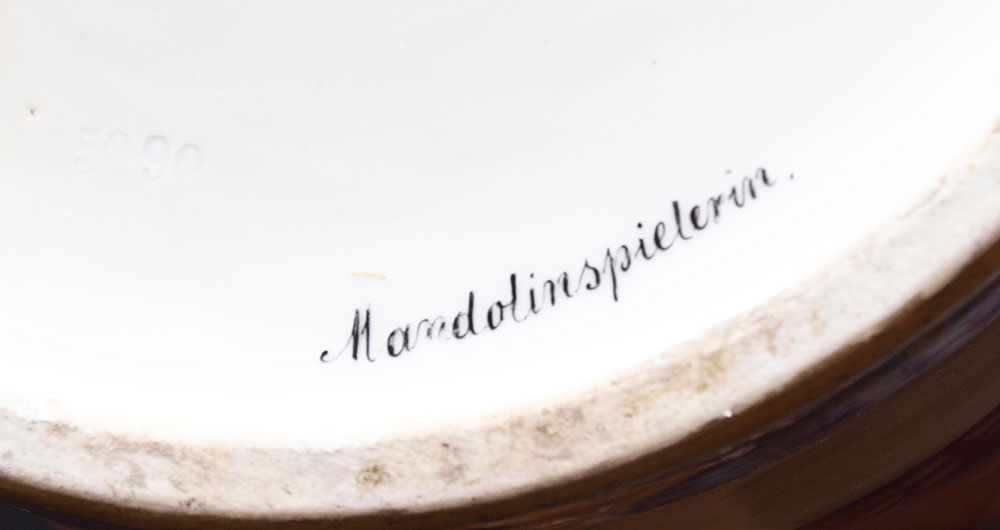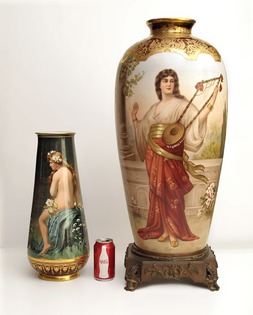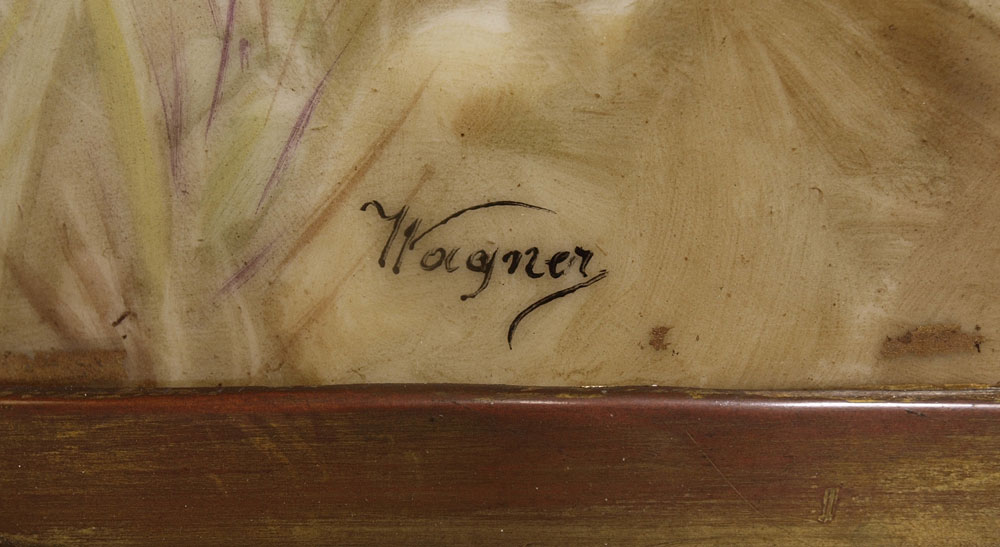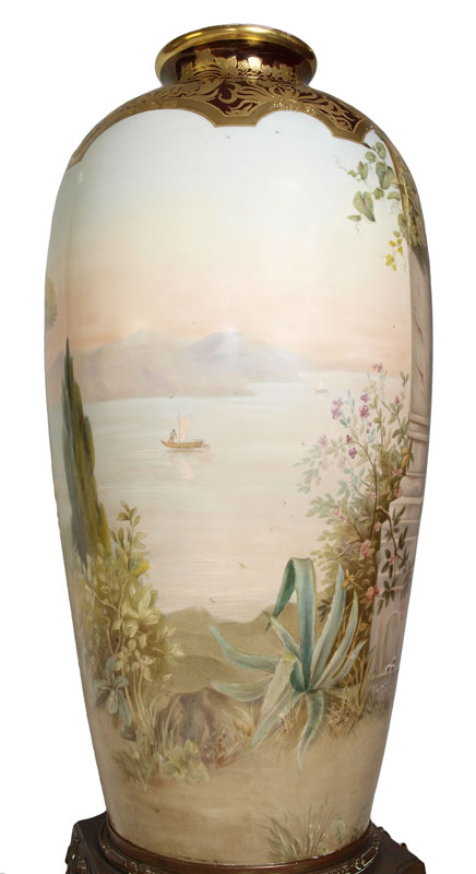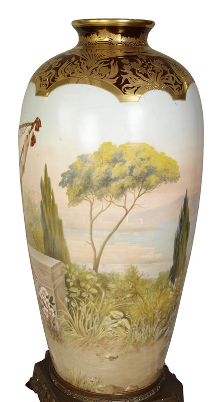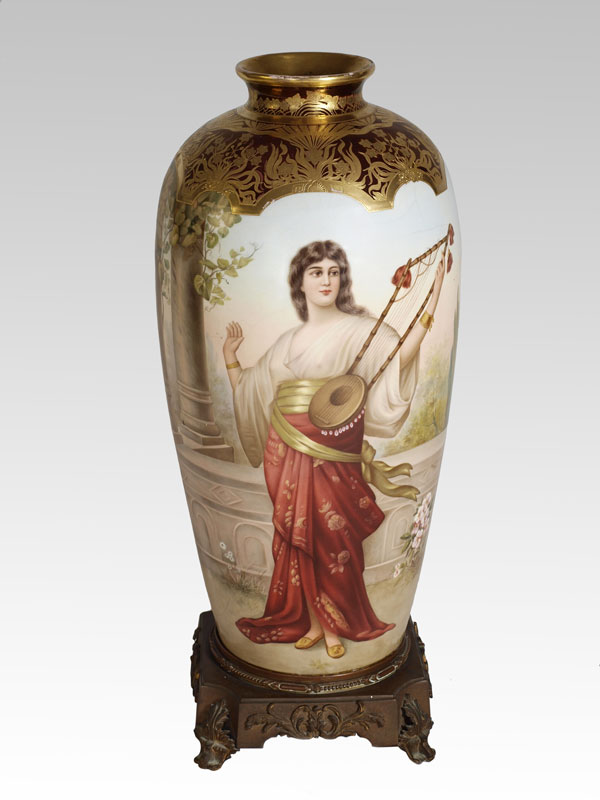 MONUMENTAL WAGNER SIGNED PORCELAIN VASE: Fine porcelain vase painted with the image of a mandolin player in flowing gown, in a serene landscape. Embossed gold shoulders leading to the rim. Mandolinspierlerin hand written on the underside. Approx. 27'' tall, 44 lbs. Sold with metal base with applied decoration. One section of decoration missing. Base 4 1/2'' h. x 11'' square. Overall 31'' h. with base.