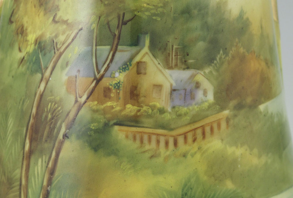 HAND PAINTED NIPPON PORCELAIN VASE: Scenic landscape with beautiful Aesthetic gold decoration. Maple leaf mark. Approx. 12 1/4'' tall x 6 1/2'' wide.