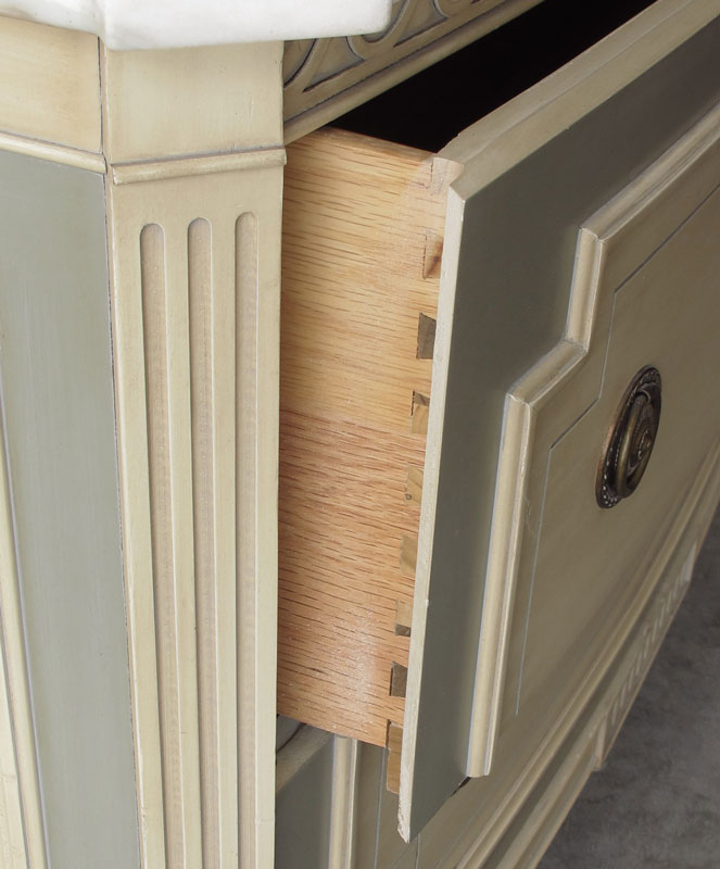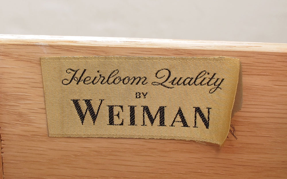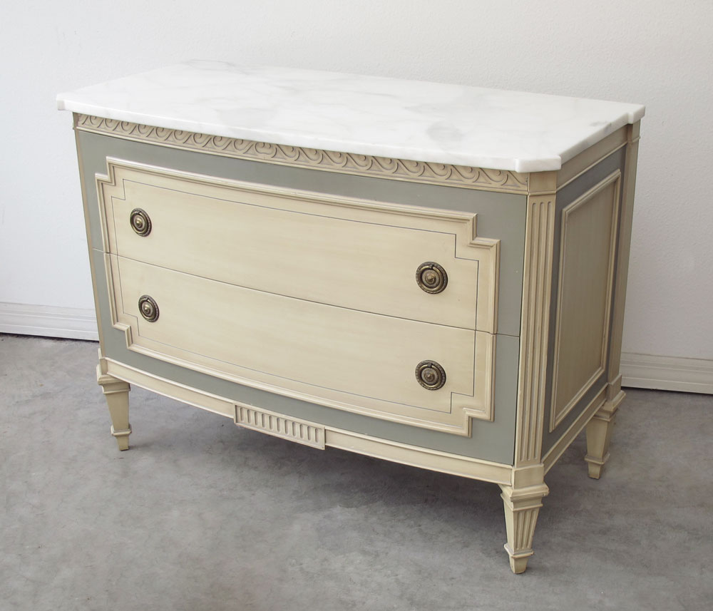 WEIMAN FURNITURE MARBLE TOP COMMODE: Cookie corner top over 2 drawers. Painted finish. Approx. 30'' x 40'' x 18''.