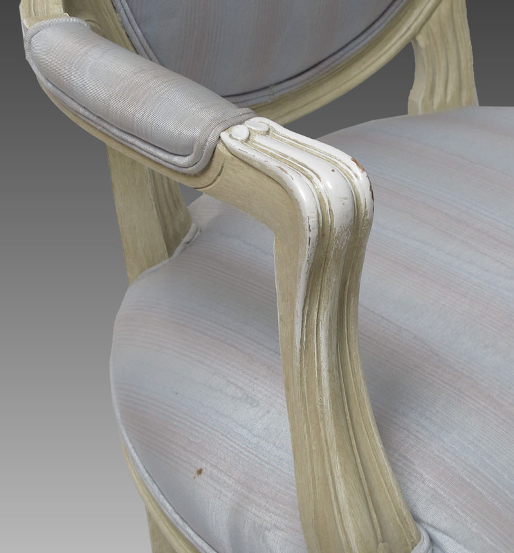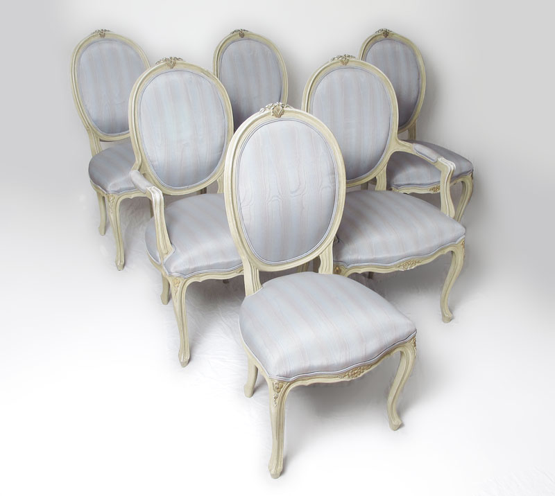 SET OF 6 FRENCH STYLE DINING CHAIRS: Carved rails, carved and shaped skirt and front legs. Antiqued white finish with blue and purple striped upholstery, blue velvet backs. 2 arm chairs 42'' h. x 24'' x 75'' and 4 side chairs.