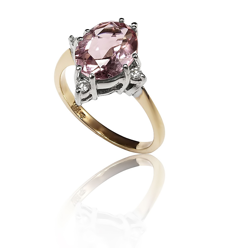 2.27 CT PINK TOURMALINE & DIAMOND RING: 14K yellow gold ring centers an approx. 2.27 Ct shaped mixed cut tourmaline, VS in clarity. The four diamonds total approx. .12 Ct., VS in clarity and GH-I in color. All stones are prong set. Size 6. Sold with current Atlanta Gemological GIA graduates appraisal for $1,050.