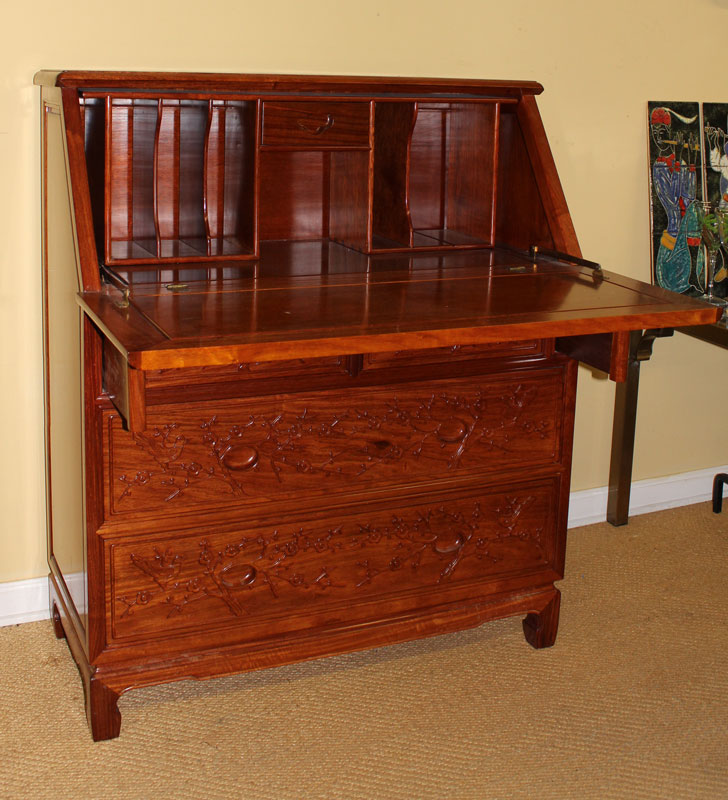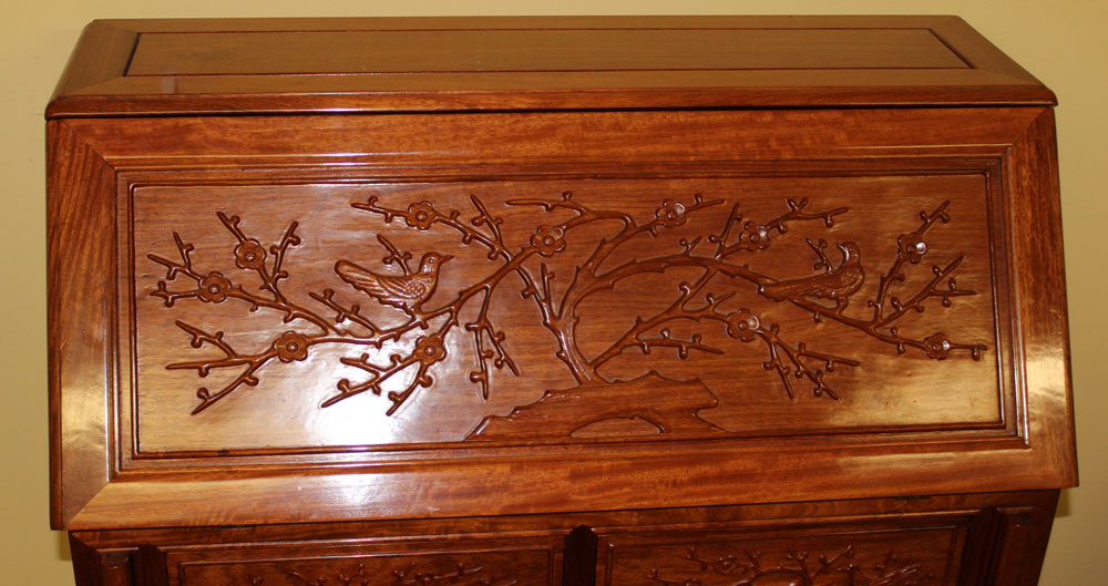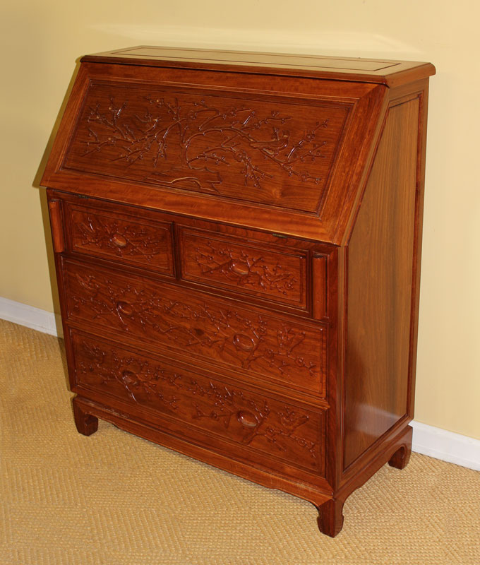 ROSEWOOD SECRETARY ORIENTAL MOTIF: Carved birds and branches on panels in the oriental style. Slant front opens to reveal pigeon holes and single drawer. 2 half drawers over 2 full length drawers. Measures 62'' h. x 36'' x 17''