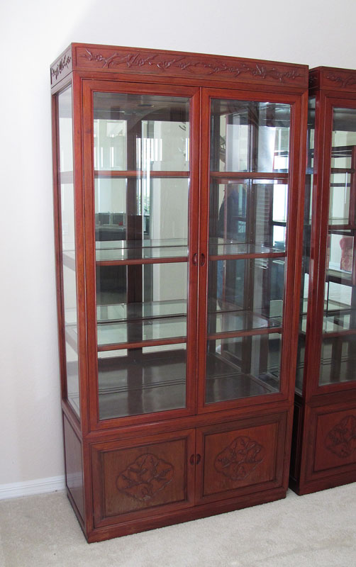 MODERN CHINESE CURIO DISPLAY CABINET: Cornice carved in a branch and bird motif, over double glass doors and glass sides, interior with glass shelves, top ready for light for illumination, bottom has blind storage with matching design to doors. Approx. 80'' tall x 40'' x 17''. See next lot for matching converted entertainment cabinet.