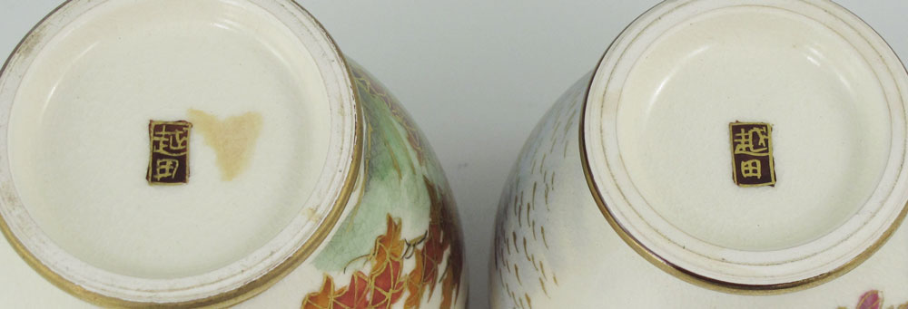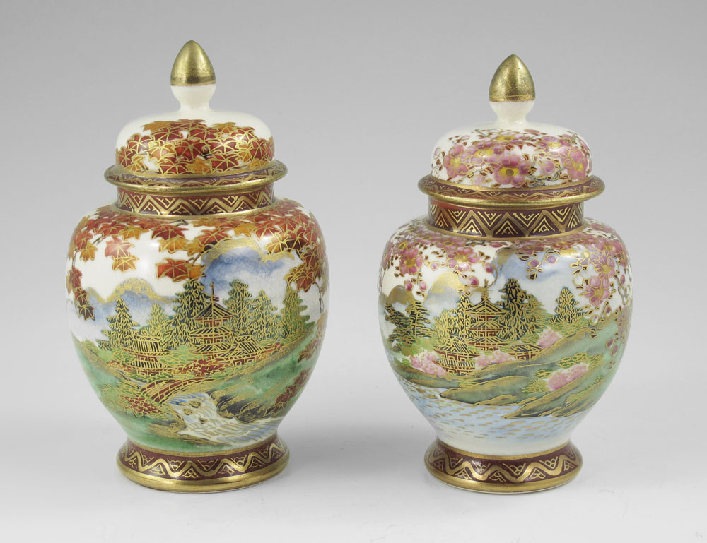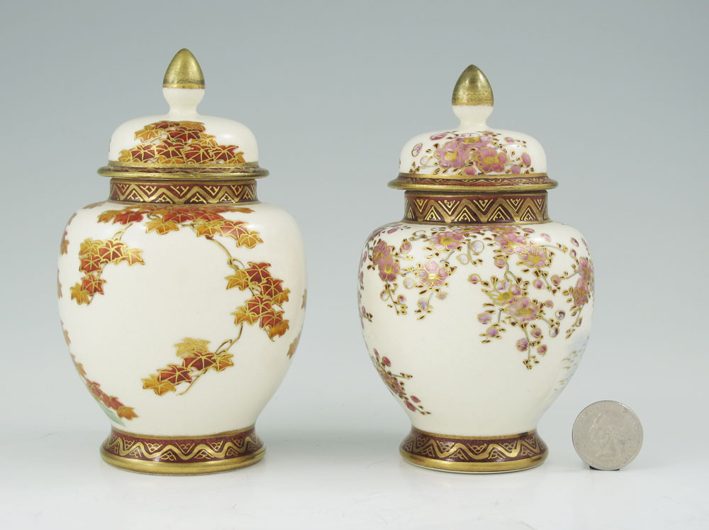 TWO SIGNED JAPANESE SATSUMA COVERED JARS: One representing autumn, the other spring. Approx. 5 1/2'' tall.