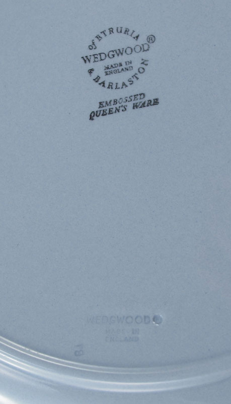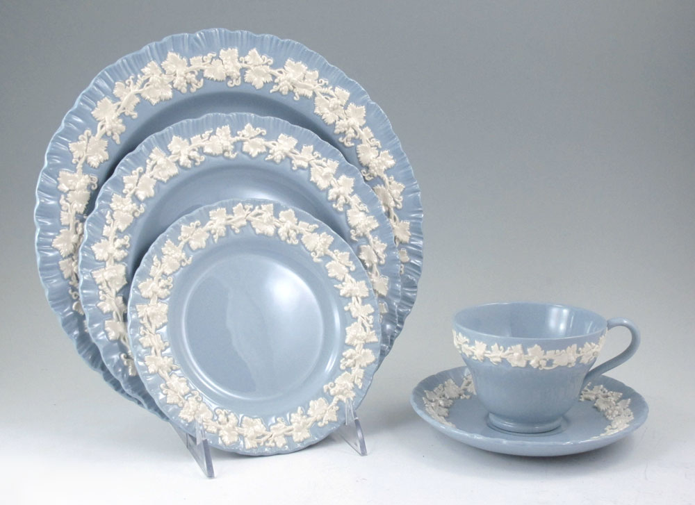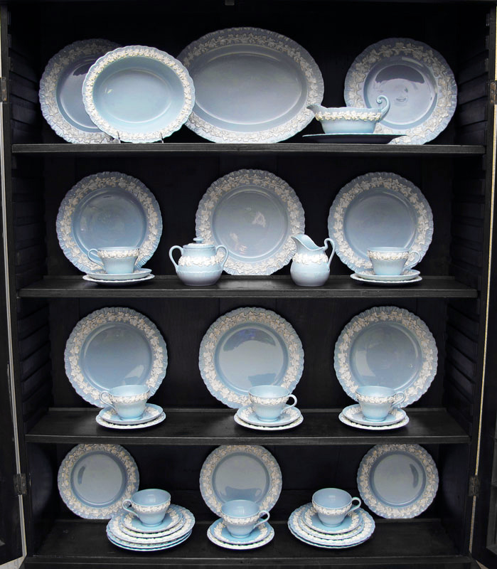 WEDGWOOD QUEENSWARE CHINA: White on Blue, 46 pieces to include: 8 Dinner Plates (10 1/4''), 8 Salad Plates, 8 Bread Plates, 8 Tea Cups, 8 Saucers, 1 Open Vegetable, 1 Gravy w/Underplate, 1 Cream, 1 Covered Sugar, and 1 Platter (14'').