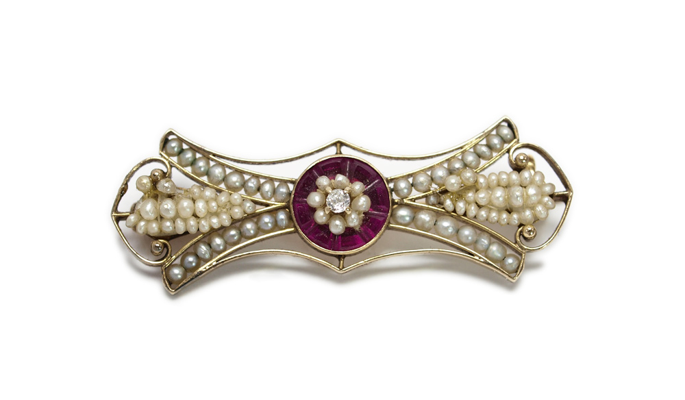 ARTS & CRAFTS DIAMOND, RUBY & SEED PEARL GOLD PIN: 14k yellow gold pin centers an old mine cut diamond of approx. .05 Ct., rated VS in clarity and H-I in color. The channel set, calibre cut synthetic rubies total approx. 1.00 C. Seed pearls throughout. Pearls are wire and fiber strung, with some repair. Bar pin closure. Included is the period Arnold & Lewis, Manchester presentation box. Sold with current Atlanta Gemological GIA graduates appraisal for $850.
