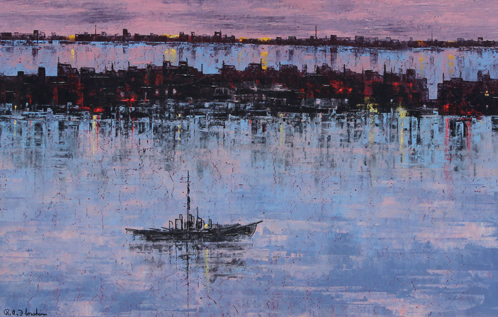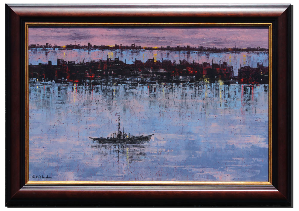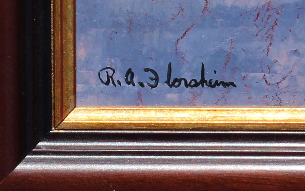 FLORSHEIM, Richard, (American 1916-): ''Home Port'', Oil/Masonite, 12'' x 18'', signed lower left, encased in custom black frame with gilt accent, 14 1/4'' x 20 1/4'', included verso is the original Oehlschlaeger Gallery's pamphlet for Florsheim with this painting illustrated in it.