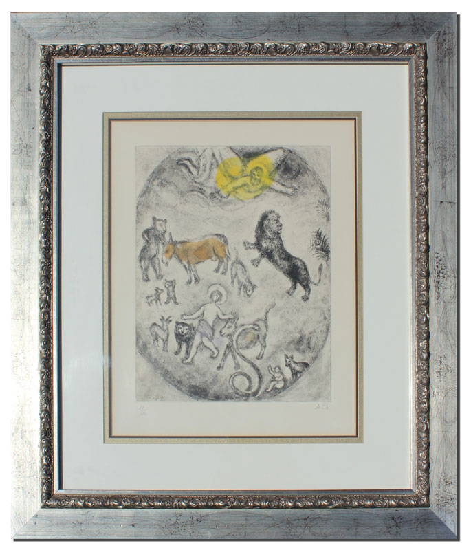 CHAGALL, Marc, (French, 1887-1985): Christ with the Animals, from the Bible series, Etching on Arches, 15'' x 12'', large margins, 20 1/2'' x 15 3/8'', pencil signed lower right, #'d 81/100 lower left, silver gilt frame, 25 1/2'' x 23''.