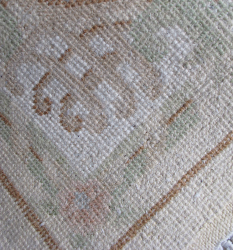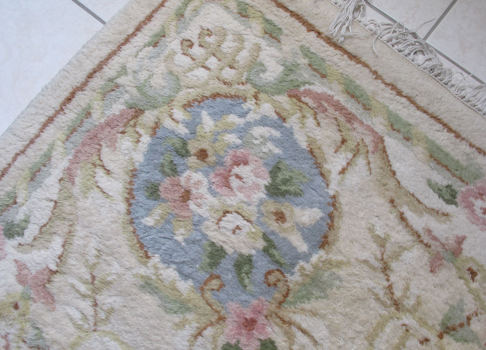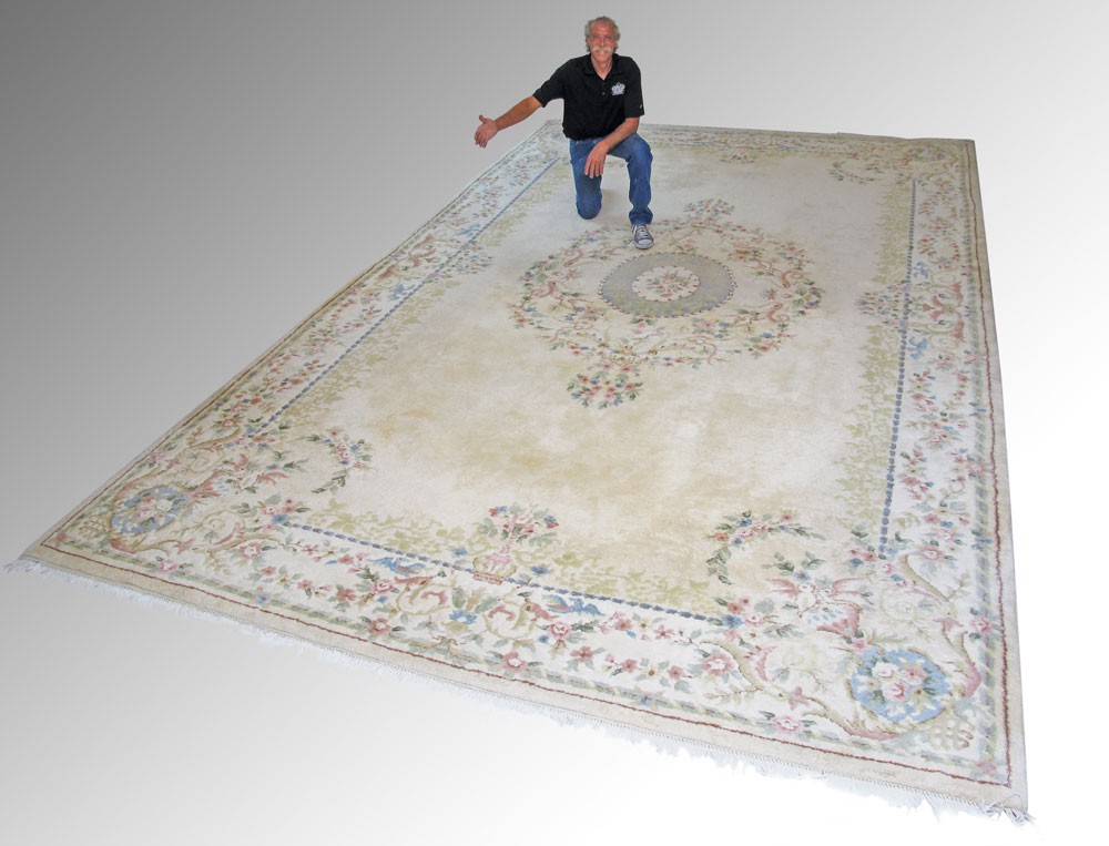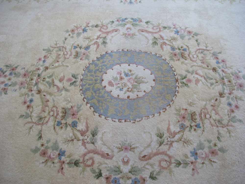 MODERN INDO-CHINESE HAND KNOTTED WOOL PALACE SIZE RUG, 11' x 18': A very large open field pastel colored rug that has a pale blue and pale yellow round central medallion. The medallion is surrounded by a tracery design of flowers and leaves done in shades of pale pinks, and blues. The rest of the ivory field is open except for a pale beige tracery motif at the edge. The main border has a white ground that also has a tracery design like that found in the field. Condition is good.