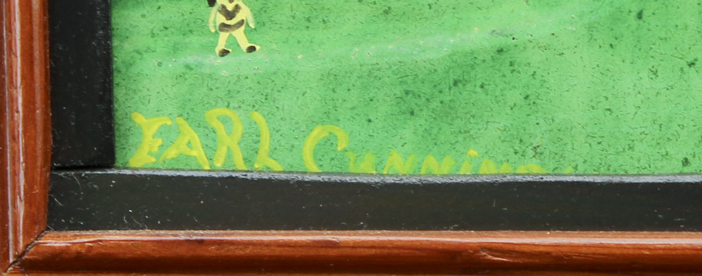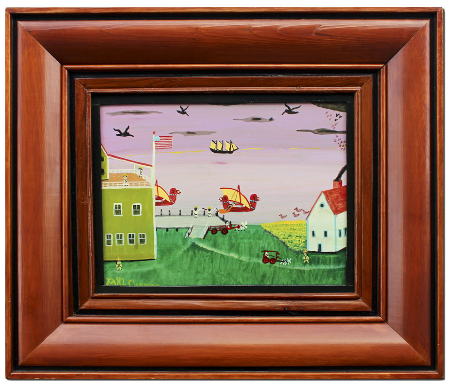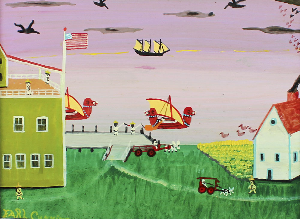 CUNNINGHAM, Earl, (American, 1893-1977): Naive Landscape with Figures and Viking Ships, Oil/Board, 12'' x 15 1/4'', signed lower left, custom wood frame, 21 1/2''x 25 1/4''. From the Mennello Collection.