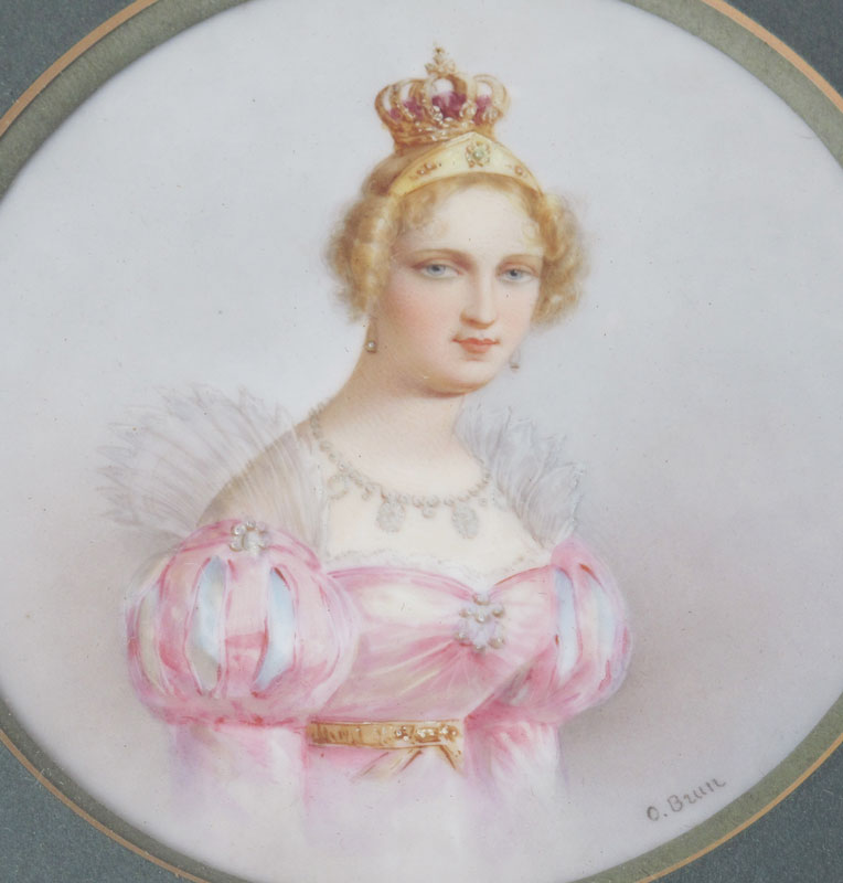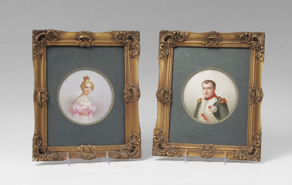 O. BRUN PORTRAITS ON PORCELAIN OF NAPOLEON AND ROYAL WOMAN: Portrait of Napoleon and unknown Royal woman painted on porcelain plaques, each signed O. Brun. Napoleon is marked on back ''Napoleon Ver'' and illegible pencil marks. Woman marked on back ''Reine Hortense'' with illegible pencil markings. Sight size 5'' dia, framed in carved gilt wood frames, 12 1/4'' x 10 1/4''.