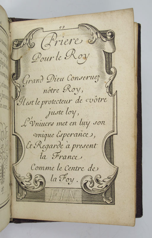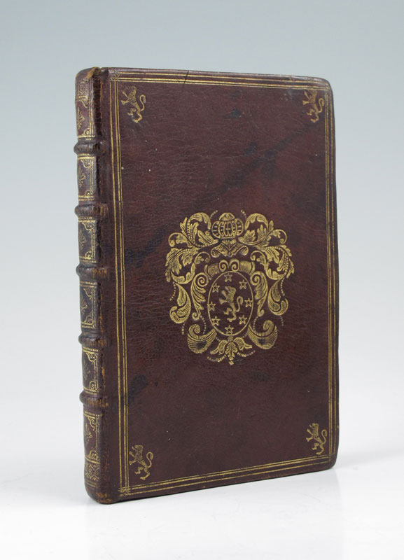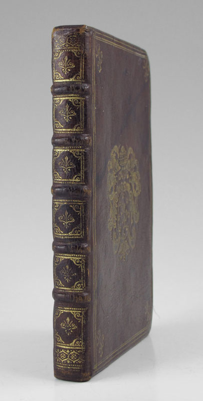N.D.T.: ''Reflections sur quelques parolles de Jesus-Christ. Particulierement sur les Sept qu'il a prononcees sur la Croix. Pour seruir d'un Saint Entretien a L'ame Chretienne Pendeant la Messe.'' Paris: Cez N. Bonnart, n.d. (Circa 1690). Decorated and illustrated by Charles Le Brun, Francois de Poilly and engraved by Nicholas Bonnart. Small octavo, contemporary burgundy Morocco with the gilt stamped armorial crest of Madame de Maintenon (the Dedicatee), front and rear and lions rampant in corners, gilt decorated spine, all edges gilt, marbled endpapers, 100pp. Text in calligraphic script with each page within a ruled or decorative border. Illustrated with vignettes, decoration and initials. A nice copy bearing the bookplate of Grace Whitney Hoff, and a handwritten note indicating that this copy came from the Library at Maison de Saint-Cyr, the school that Madame de Maintenon founded and to which she retired after the death of her husband Louis XVI. In 1683 Queen Marie-Theresa (1638-1863) died and Louis XVI secretly married Francoise d'Aubigne, Marchioness of Maintenon, to whom this book is dedicated.