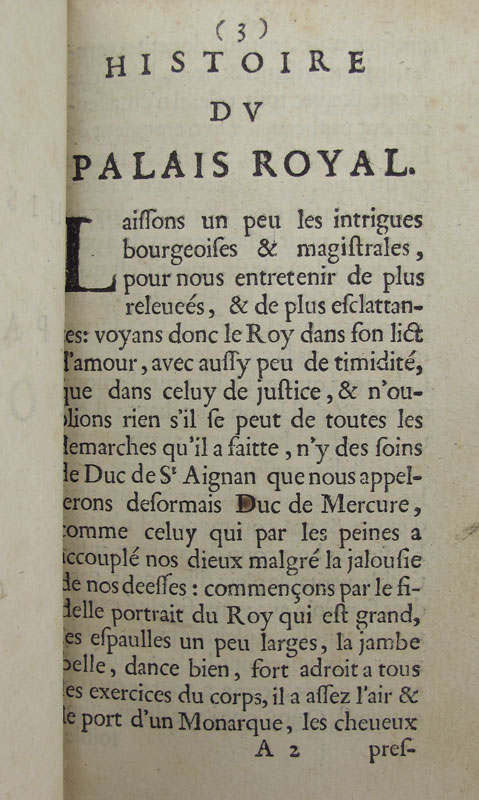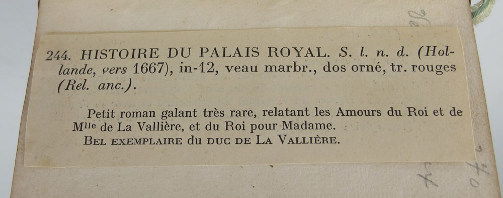 RABUTIN, Roger de, Comte de Bussy: ''''Historie du Palais Royal'', N.1, n.p., n.d. (Holland, circa 1667). Duodecimo, original mottled calf, gilt stamped spine, marbled endpapers, (ii), 3-96 pp. Avery nice copy bearing the bookplates (two different) of the prominent collector and philanthropist Grace Whitney Hoff. A novelette purporting to relate the affair of Louis XIV and his mistress, Louise de La Valliere, (1644-1710). This title published without indicating a place or date, was according to Brunet, printed in Holland about 1667. Pages 77-96 of the book include the title ''Historie de l'amour feinte du roy pour madame.'' Both pieces are ascribed to Roger de Rabutin, Comte de Bussy, and published with his ''Historie Amoureuse de Gaules''.