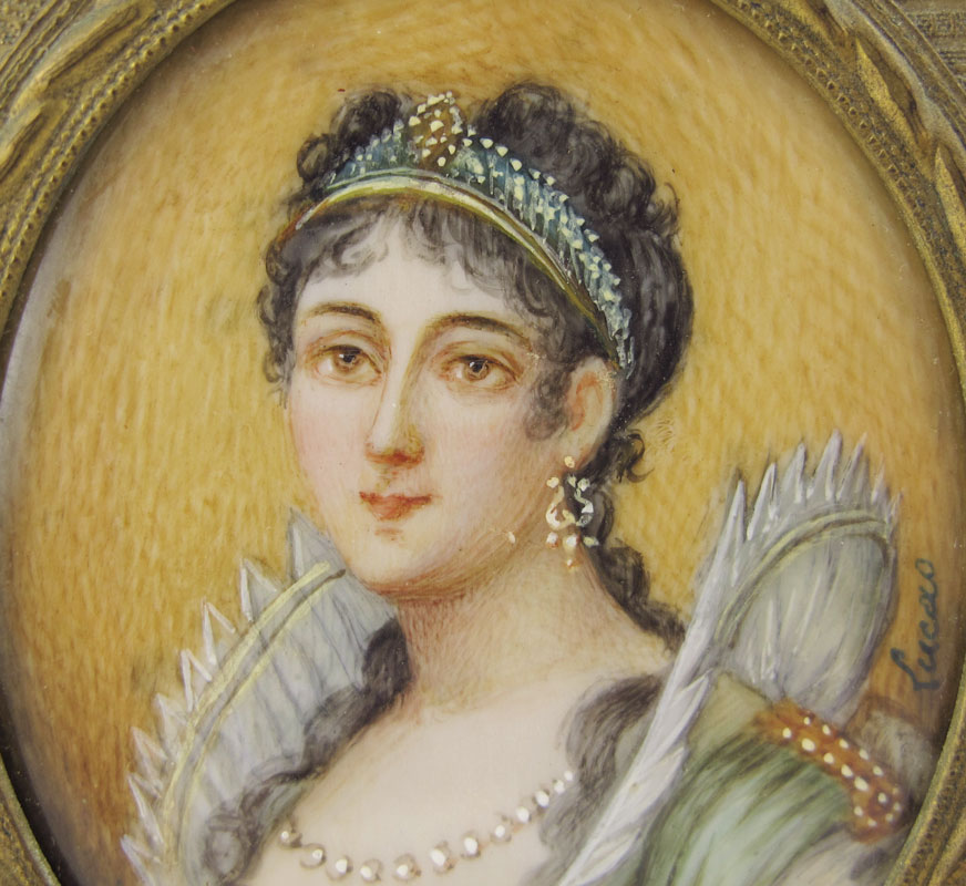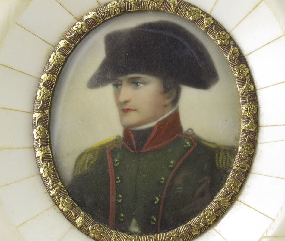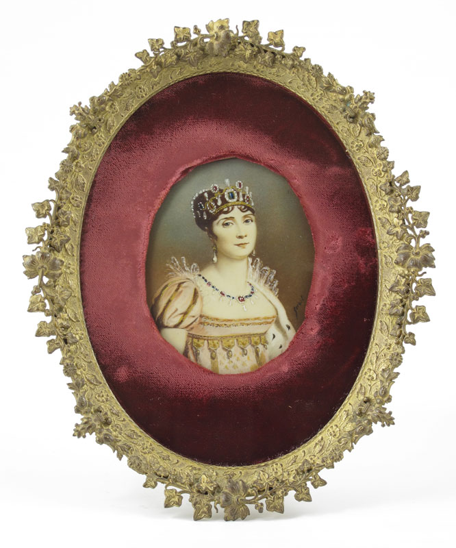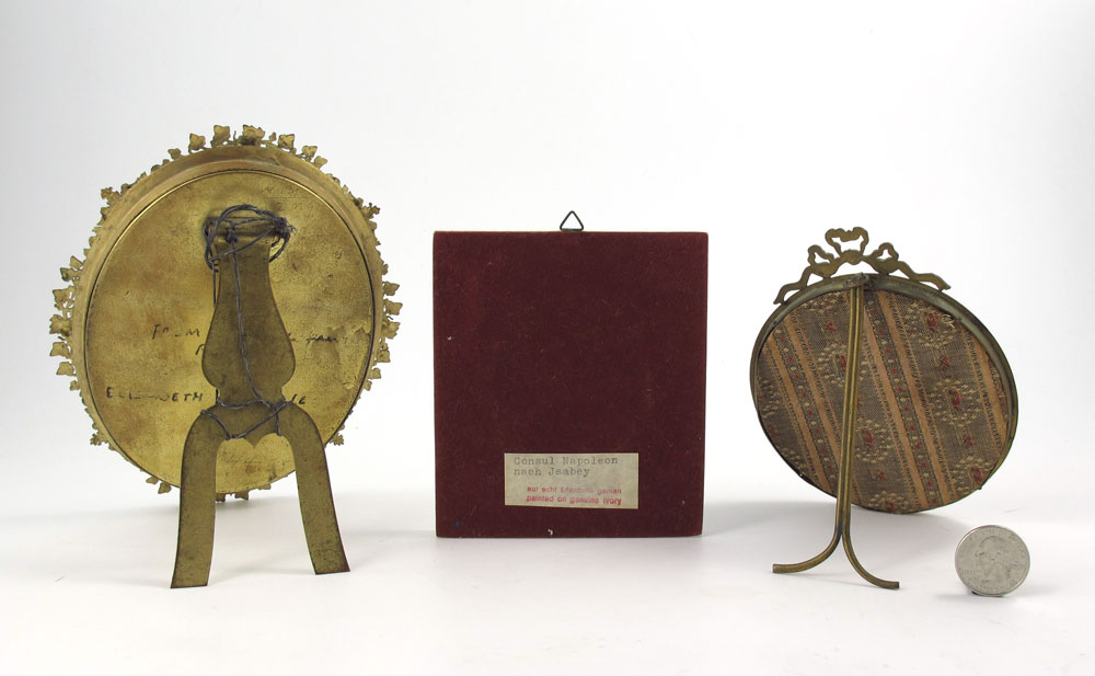 3 MINIATURE PAINTINGS OF NAPOLEON & JOSEPHINE: To include 1) Portrait of Napoleon after Jsabey on ivory with inlaid ivory and wood frame. Sight size 2 1/4'' x 1 7/8'', framed 4 5/8'' x 4''. 2) Portrait of Josephine on ivory signed Lucas in bronze frame. Sight size 2 7/8'' x 2''. Easel back frame 5 1/8'' x 4''. 3) Enhanced photograph on celluloid of Josephine after the painted by Elizabeth Vigee Le Brun, signed Gerart in gilt metal frame. Sight size 3 7/8'' x 3''. Easel back framed 6 1/2'' x 5 1/4''.