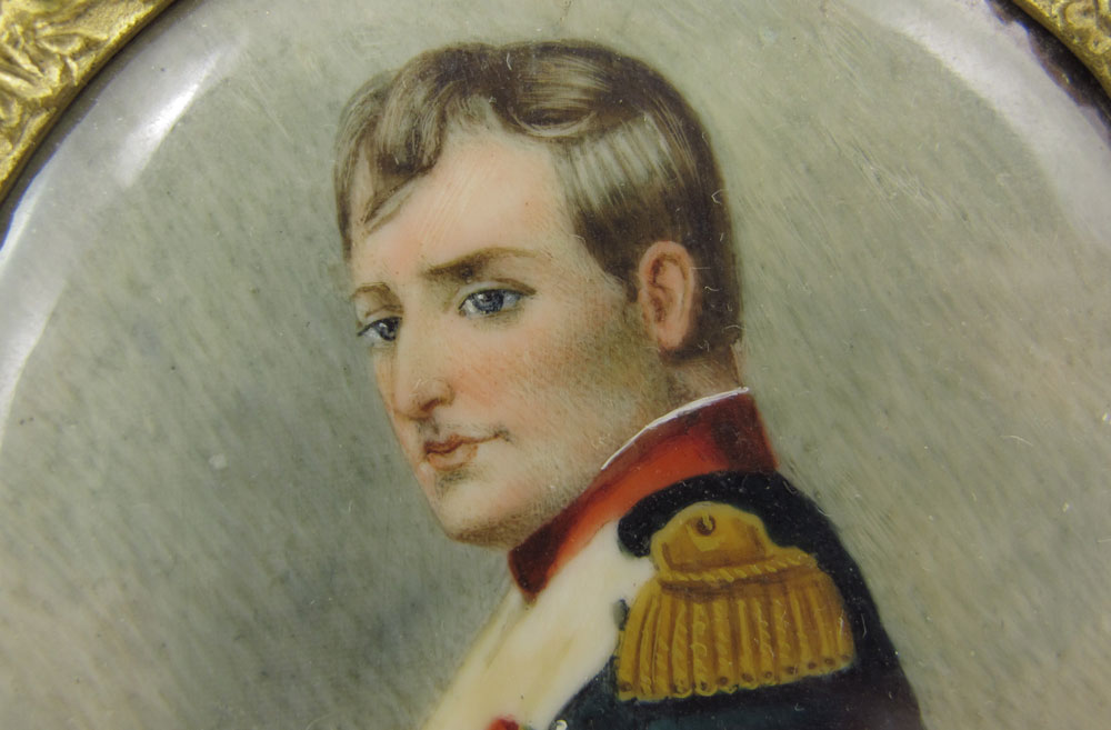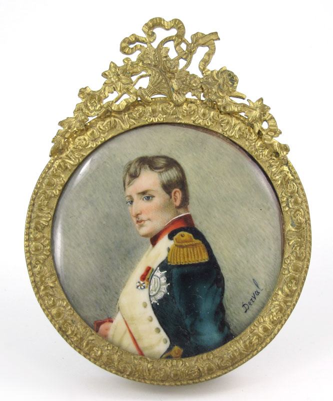 DERVAL MINIATURE ON IVORY OF NAPOLEON: Portrait of Napoleon on ivory signed Derval, in gilt metal Stern Brothers frame. Sight size 2'', frame 3 1/2'' h.