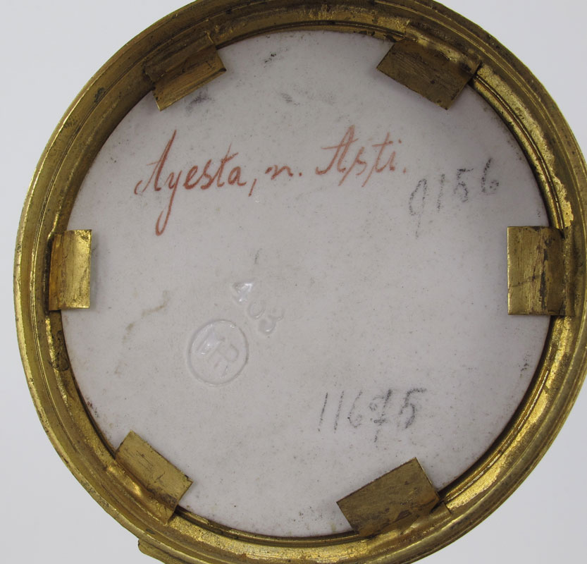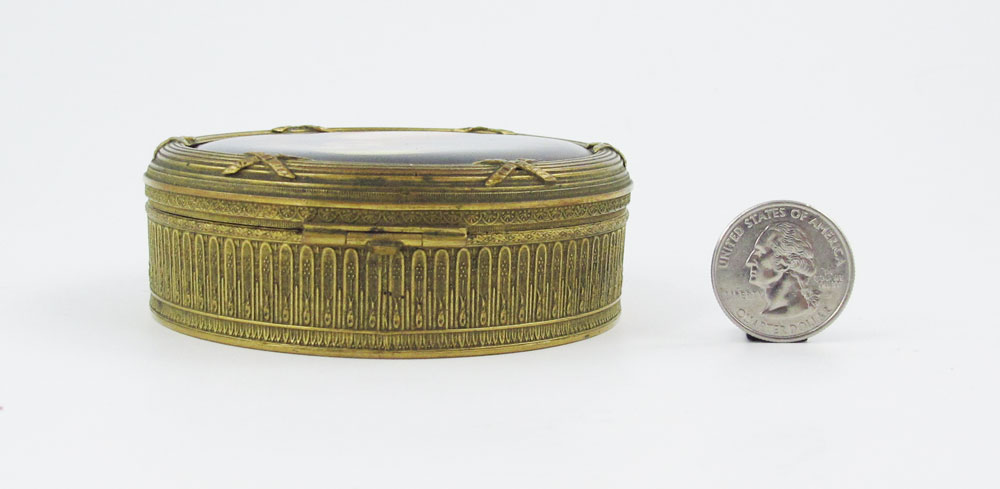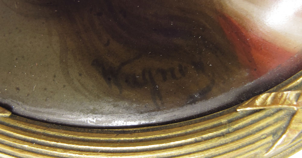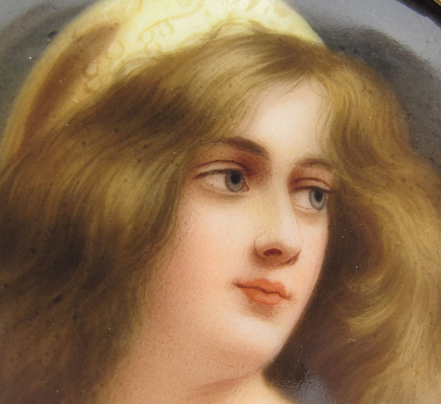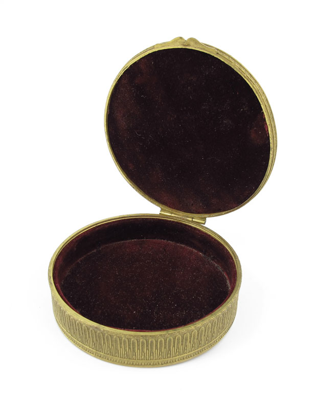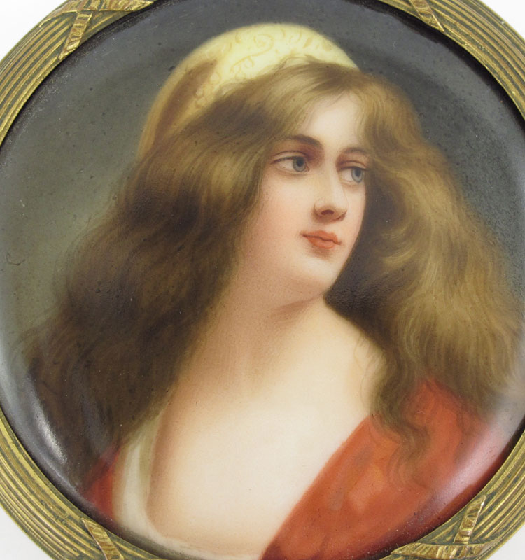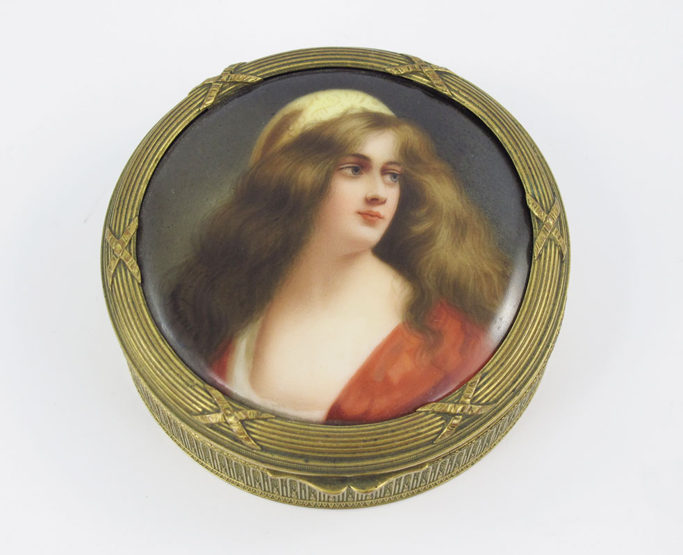 ''AYESTA'' HUTSCHENREUTHER PORTRAIT LID DRESSER BOX BY WAGNER: ''Ayesta'' by Wagner after Angelo Asti. Signed Wagner lower left on front, Impressed Hutschenreuther CMHR circular stamp verso, #463. Gilt metal box with lined interior of rich burgundy padded velvet. 3 1/2'' dia.