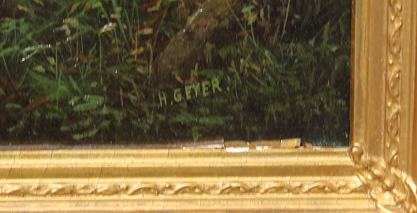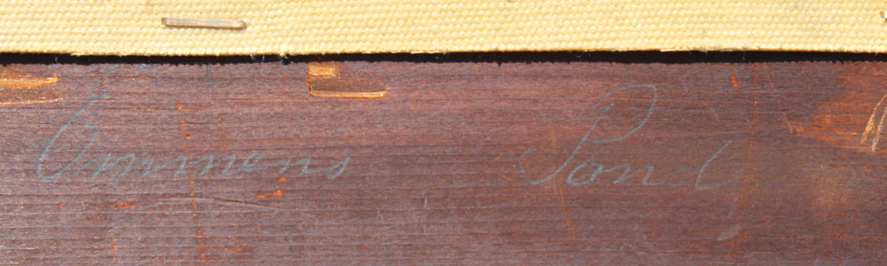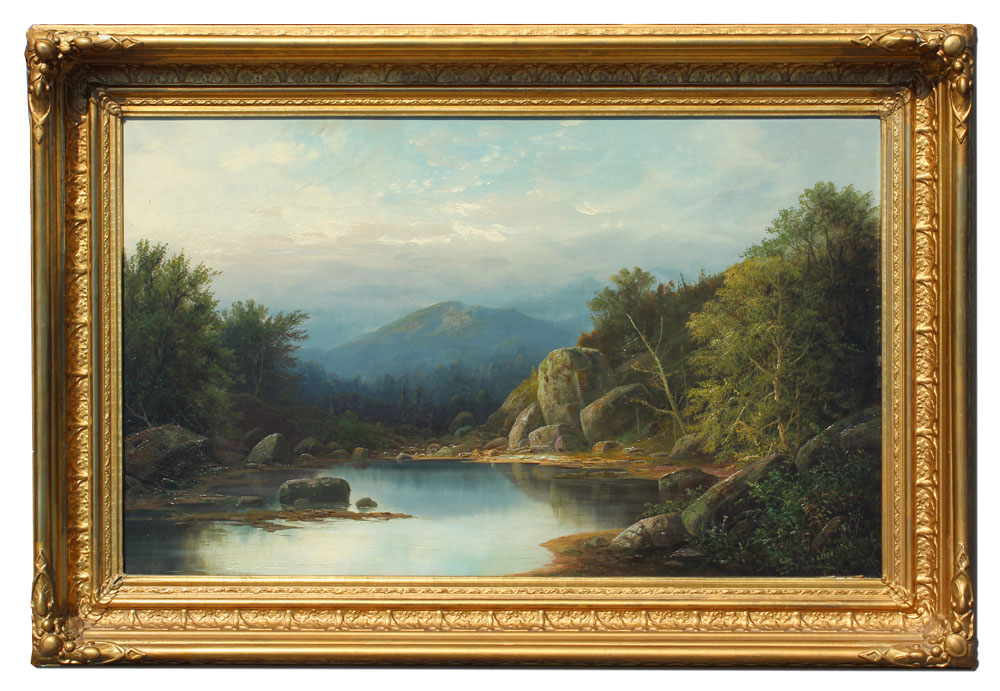GEYER, Henry, (American, 19th Century): ''Emmons Pond near Morristown'', Oil/Canvas, 22'' x 36'', signed lower right encased in period gilded and carved frame with repair and wear, approx. 29 1/2'' x 44'', pencil titled on the stretcher verso.