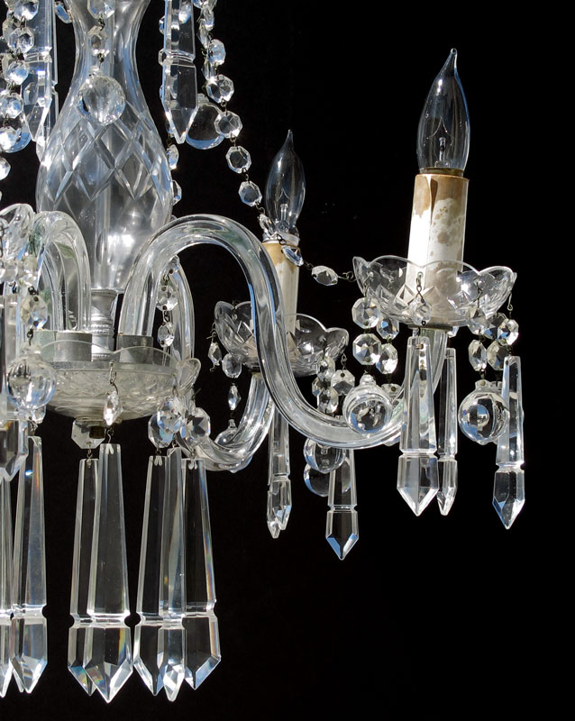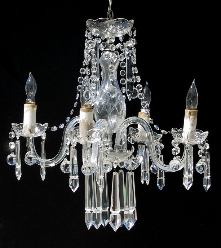 A PETITE CRYSTAL CHANDELIER: 4 light, bent crystal arms, garlands and extra long prisms. Silver tone hardware. Measures approx. 21 1/4'' h. x 18'' dia., excluding the chain.