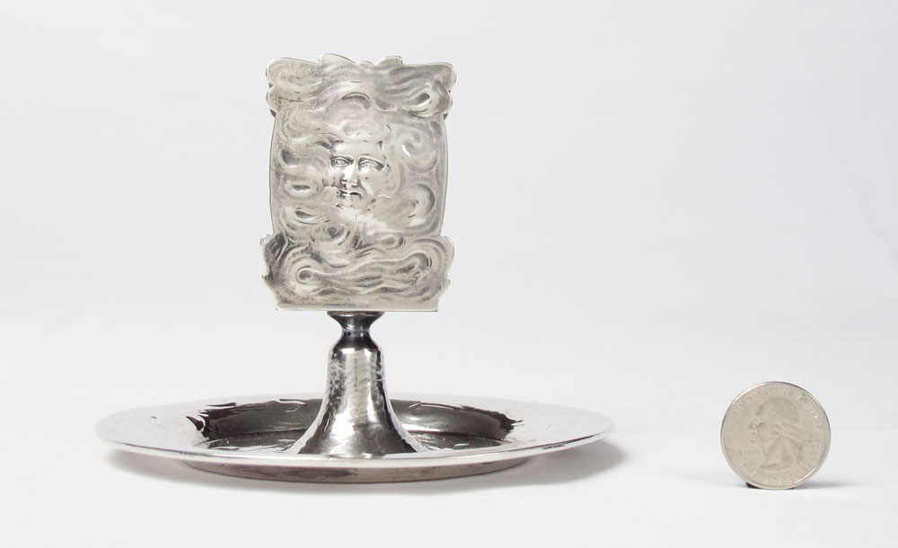 BLACK, STARR, & FROST ART NOUVEAU STERLING MATCH BOX HOLDER: Figural man's face enveloped in smoke, mounted to circular ashtray continuing the smoke motif. Measures 3 7/8'' h. x 5'' dia. Approx. 5.9 troy oz.
