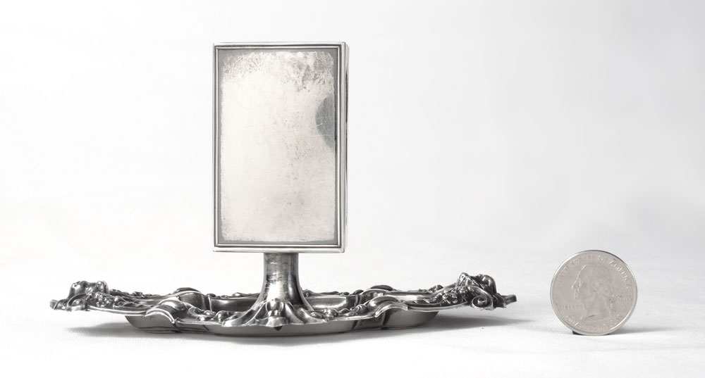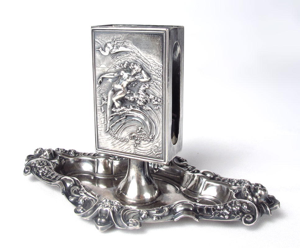 KERR MOUNTED ART NOUVEAU STERLING MATCH BOX HOLDER: Holder with full figural nude woman in crashing surf, mounted to base with repousse floral, foliate, masquerons and cherub heads. Measures 3 3/8'' h. x 5 1/2'' x 3 1/2''. Approx. 2.2 troy oz.