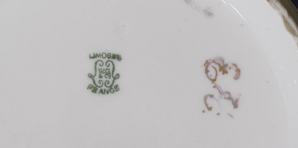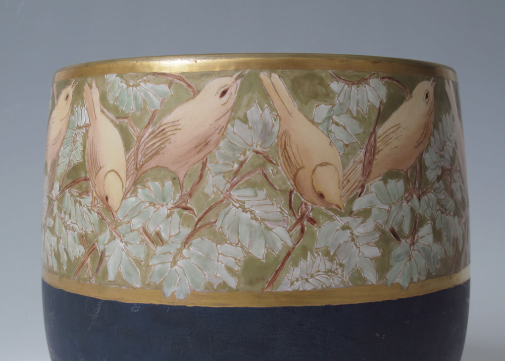 HAND PAINTED FRENCH LIMOGES JARDINIERE: Ca. 1900-1932 Wm. Guerin fine French porcelain jardiniere with an unusual deep blue body and featuring a hand painted frieze of yellow canary birds. Approx. 8'' tall x 9'' dia.