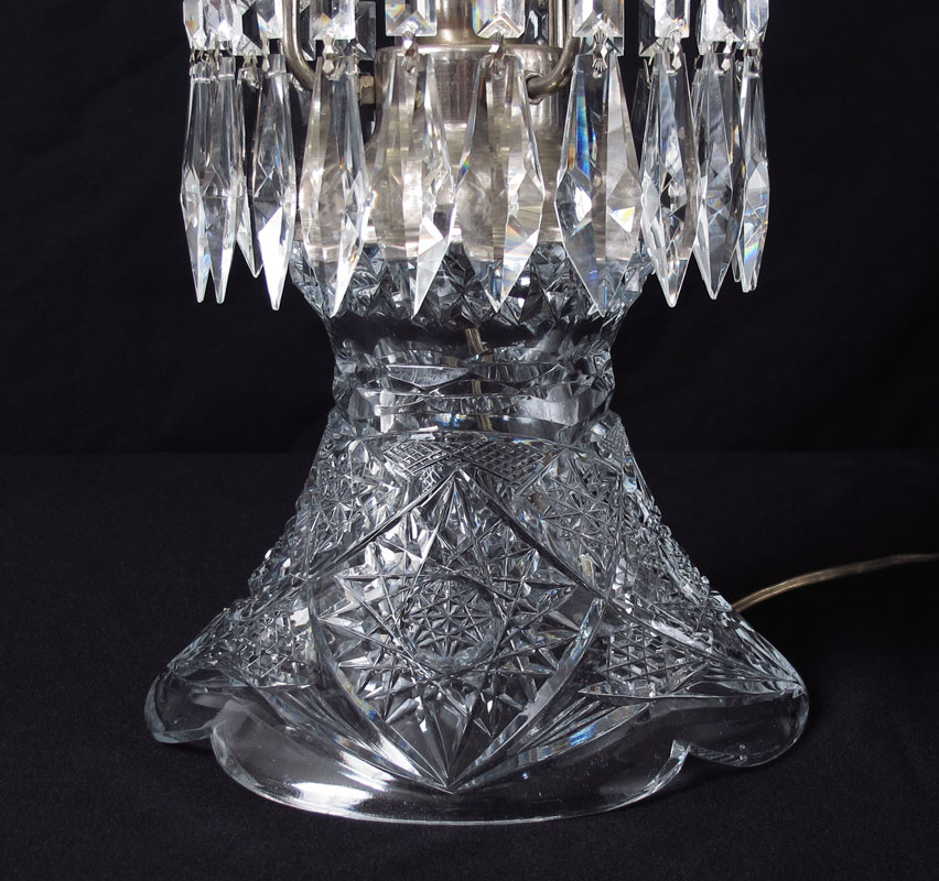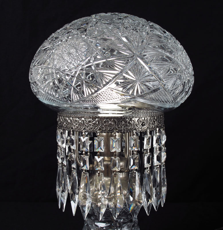 CUT GLASS TABLE LAMP: With cut crystal prisms. Mushroom shape shade, 11'' dia. overall with a 7'' fitter rim. The lamp measures approx. 18'' tall overall.