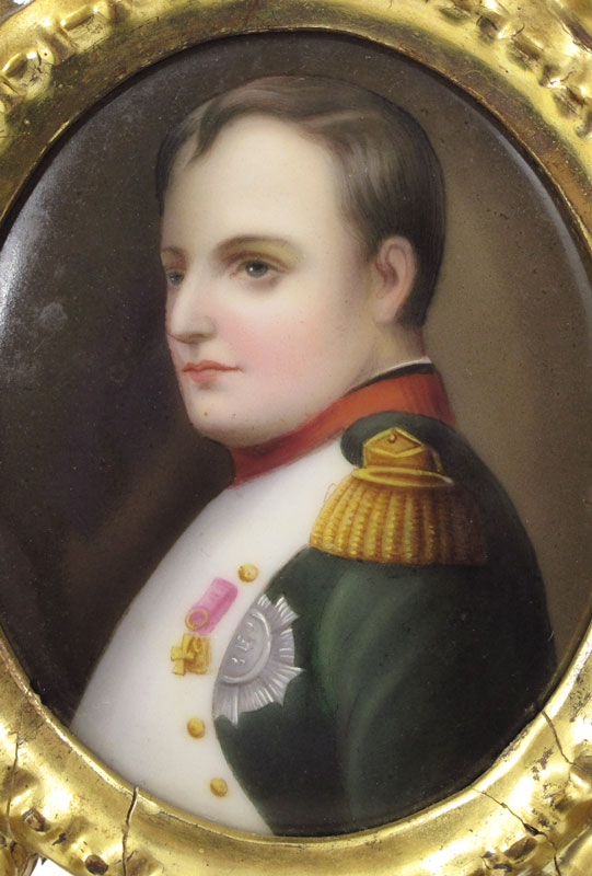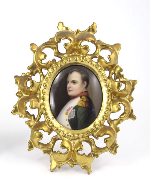PAINTING ON PORCELAIN PLAQUE OF NAPOLEON: Unsigned painting on porcelain plaque of Napoleon in classic pose in carved gilt wood easel back frame. Plaque measures 3 1/4'' x 2 1/2'', frame 7 1/2'' x 6''.