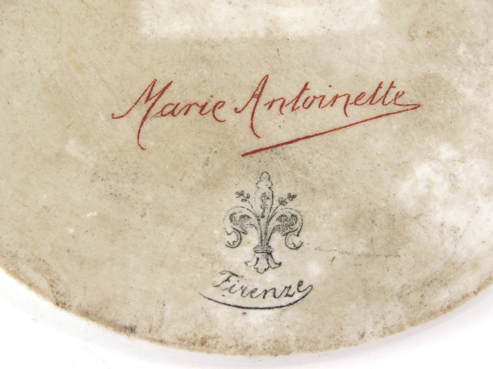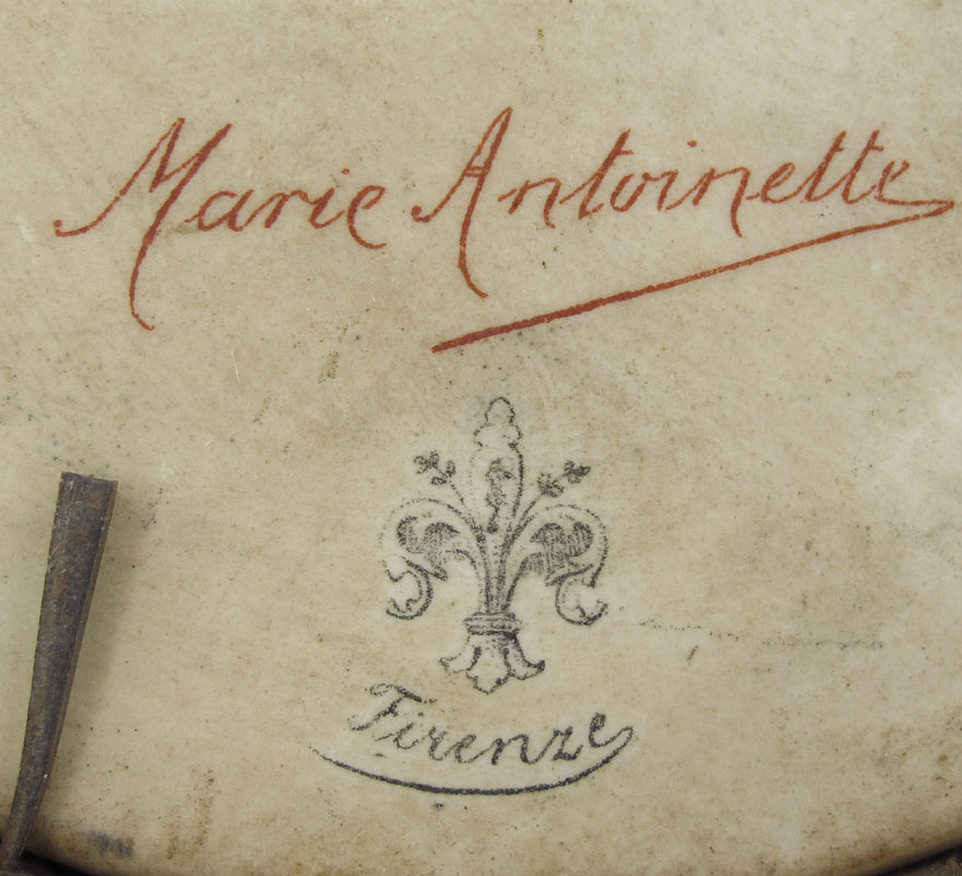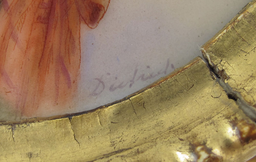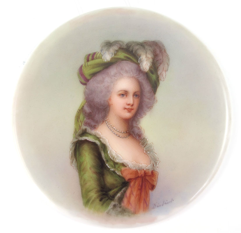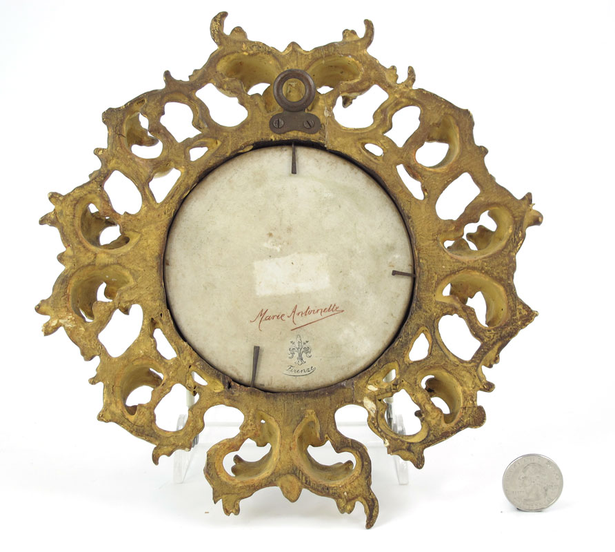 MARIE ANTOINETTE FIRENZE PORCELAIN PAINTING BY DIETRICH: The lovely Marie Antoinette as painted and signed by Dietrich. 4'' dia.. Carved and gilt wood frame, 8 1/4'' dia.