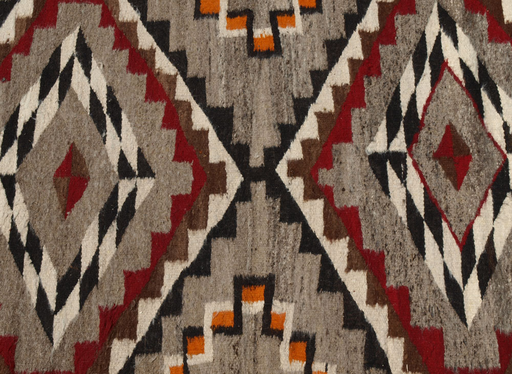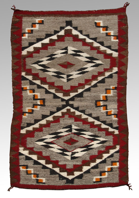 CIRCA 1930'S NATIVE AMERICAN NAVAJO HAND WOVEN WOOL RUG, 60'' x 38'': This Navajo has the colors grey, black, and white predominantly used in Two Grey Hills rugs but the addition of red and orange point to neighboring Crystal area of weaving. The rugs central motifs are two diamonds within diamonds. There is a smaller brown and red stepped diamond surrounded by a black and white small narrow diamonds that form a larger diamond. This is surrounded by a stepped block motif to form the outer diamond of the field. There are red and brown saw tooth borders on the sides and red and brown straight borders on the ends of the rug. The orange color appears in smaller zig zag motifs that may represent lightning.