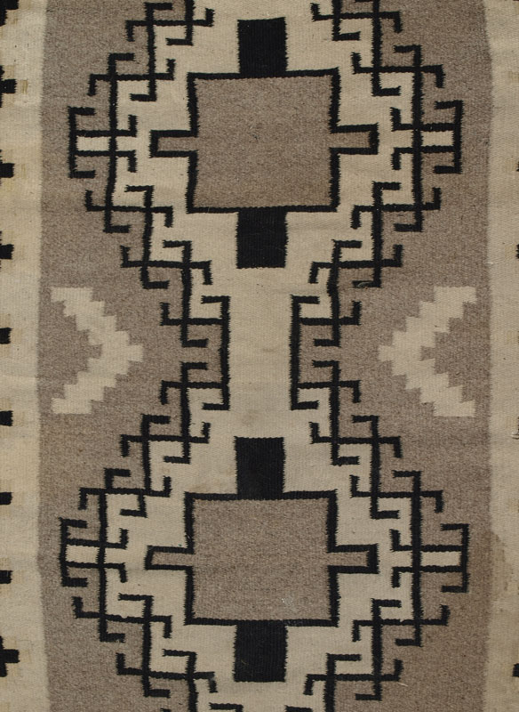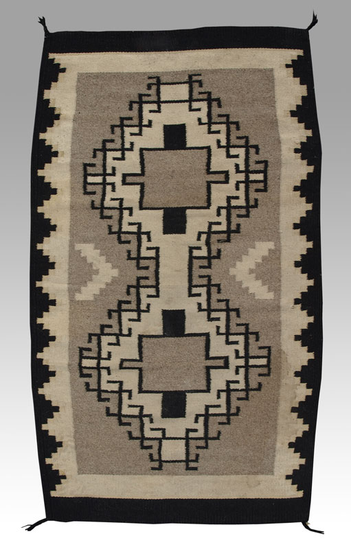 CIRCA 1930'S NATIVE AMERICAN NAVAJO HAND WOVEN WOOL RUG, 31 1/4'' x 57'': This interesting Navajo has the neutral color palette that is found in rugs woven in the Two Grey Hills region. The grey field has two joined block stepped diamond medallions with white grounds. Each has a central stepped block design in black and white. The medallions also have a black lattice / latch hook design around their edges. This motif makes the medallions stand out. In between the two diamond medallions are Vee shaped designs in white. The borders of the rug have a stepped design in black, white and a faded pale yellow/beige. All in all, an attractive rug.