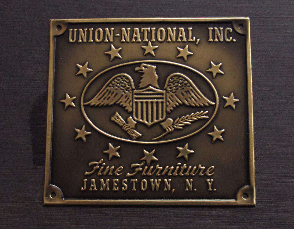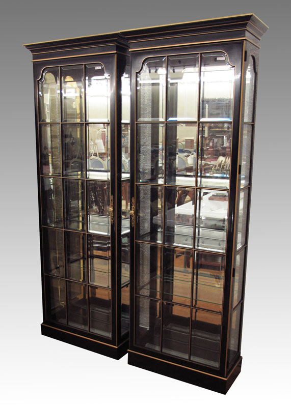 PAIR BLACK & GOLD DISPLAY CHINA CURIO CABINETS: Union National, Jamestown NY. Key locking upright cabinets. Beveled glass door fronts. Glass shelf interior. One key for both cabinets. 83'' x 30'' x 13 1/2''.