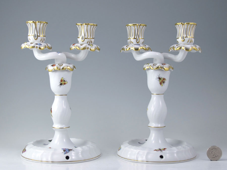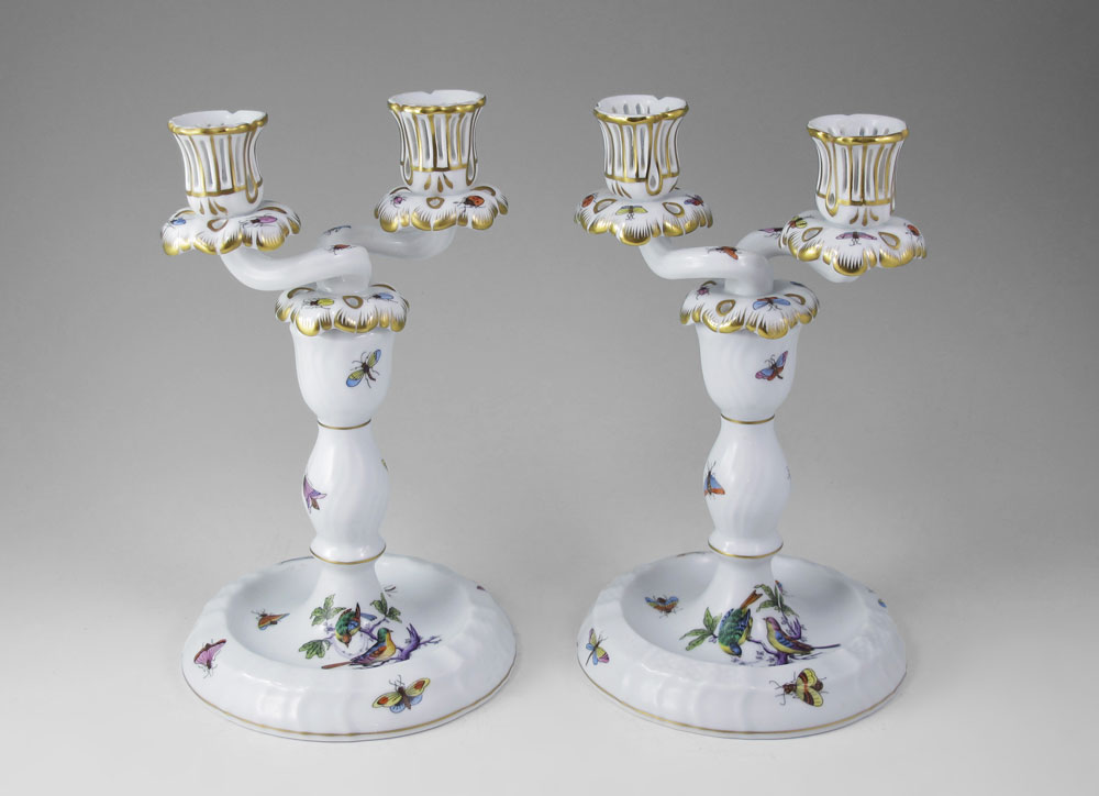HEREND PORCELAIN CANDLE HOLDERS: Rothschild Bird pattern. Two light, 9'' candelabra converts to pair of single 6'' holders.
