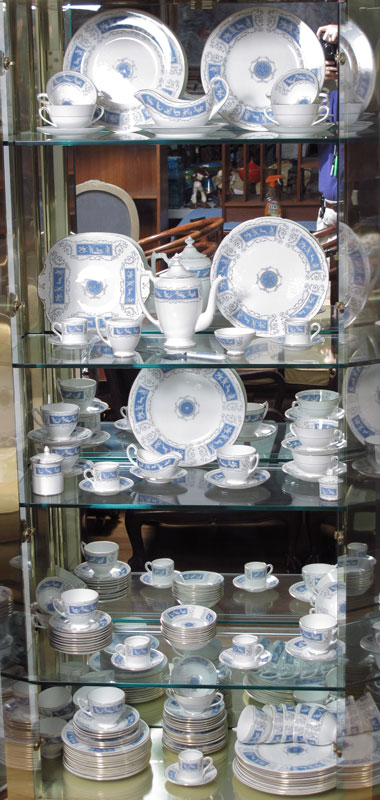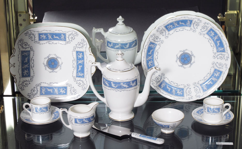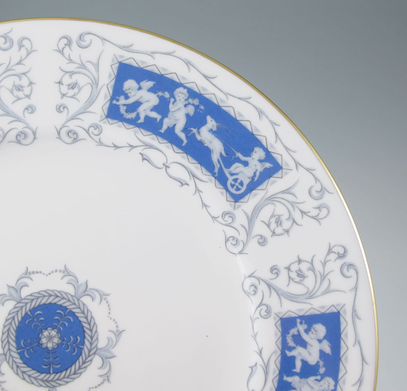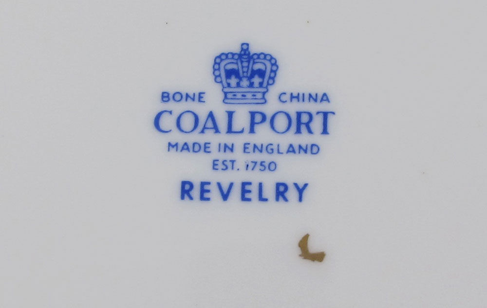 COALPORT ''REVELRY'' FINE CHINA SERVICE: Cupid decorated, scallop rim with gold edge. Approx. 124 pieces to include 12 dinner plates (10 3/4''), 12 salad plates (8''), 11 bread plates, 8 dessert bowls, 12 cream soups with 12 saucers, 6 demitasse cups with 6 saucers, 19 footed cups with 18 saucers, square sandwich server, round cake plate, porcelain handle cake server, sauce boat with underplate, gravy with underplate, coffee pot, creamer, open sugar, mustard and a jam jar.