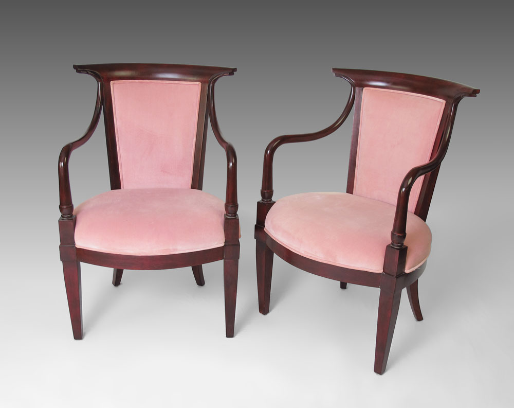 PAIR MAHOGANY FRAMED PARLOR CHAIRS: Gently curved open arms, pink velvet seats and backs. 36'' x 24'' x 20''.