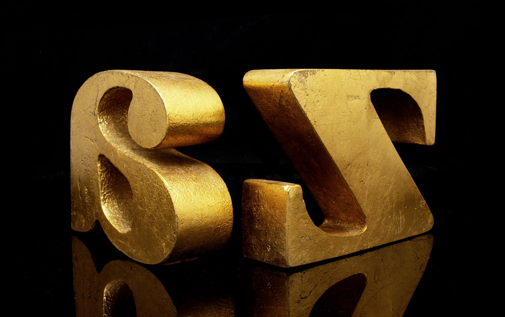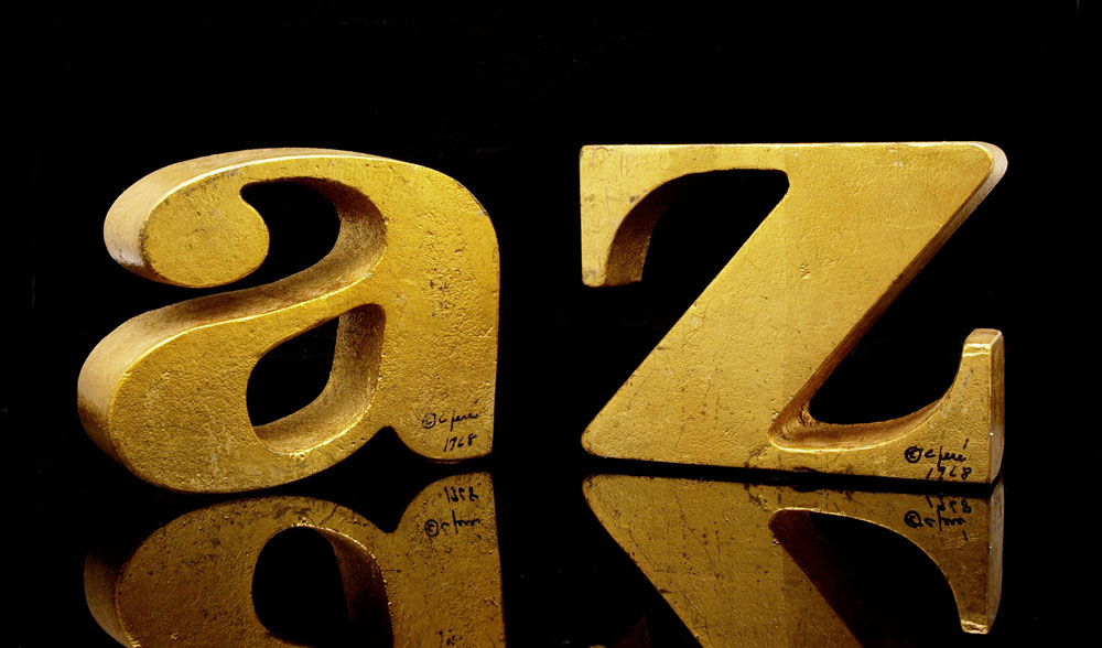 CURTIS JERE SIGNED A-Z BOOKENDS: Heavy cast metal with gilt finish. Signed C. Jere and dated 1968. Measures 4 1/2'' x 5 3/4'' x 1 5/8''.