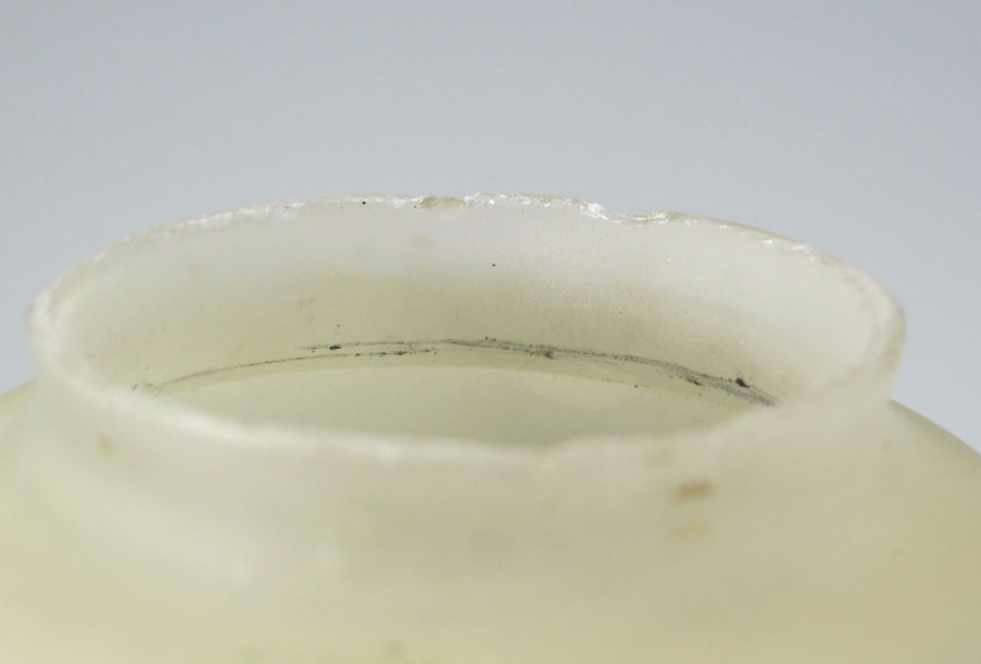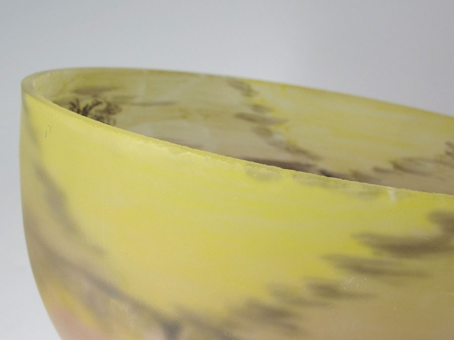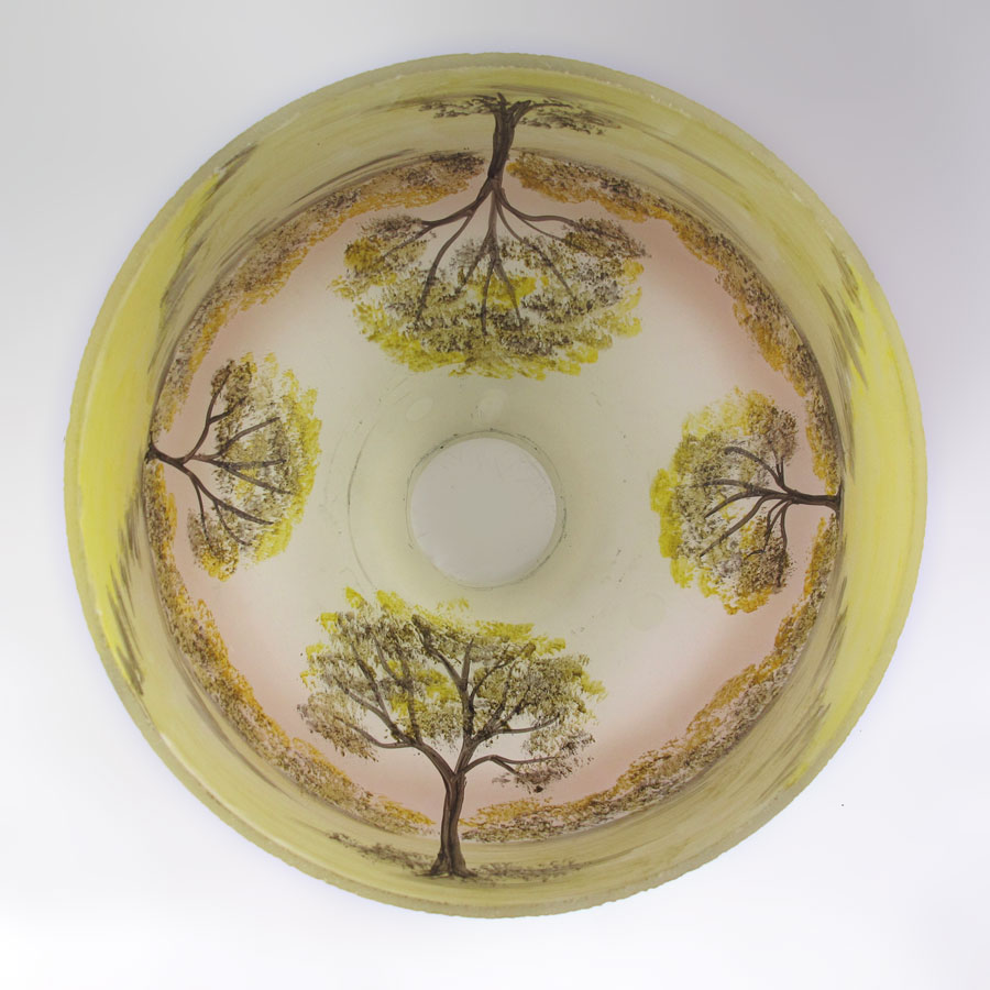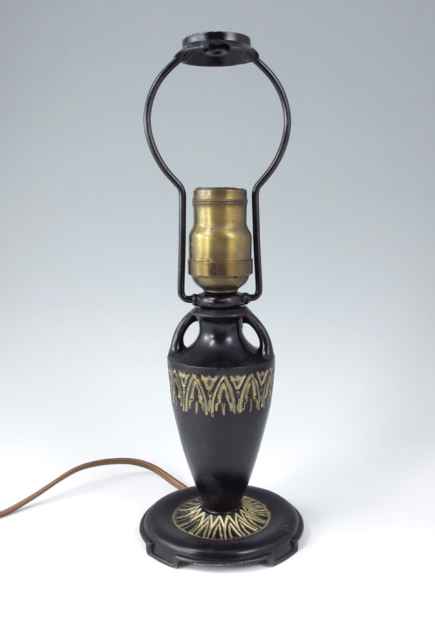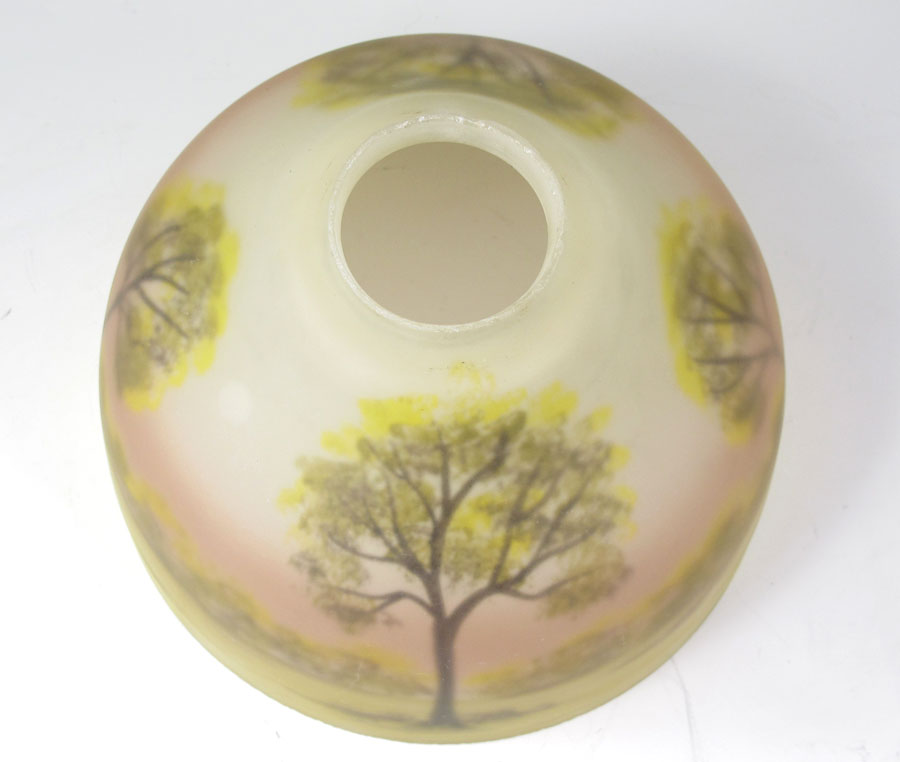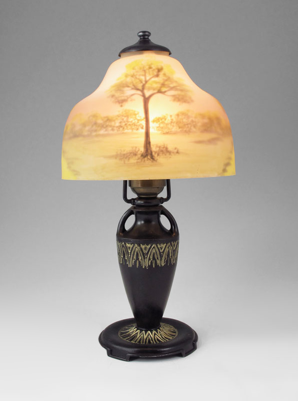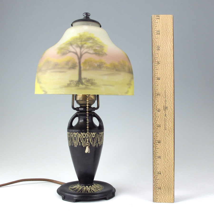 SIGNED MOE BRIDGES SCENIC BOUDOIR LAMP: Reverse painted glass shade over bronzed metal base with incised decoration. Single socket, pull chain. Measures approx. 13'' tall, shade 7'' dia.