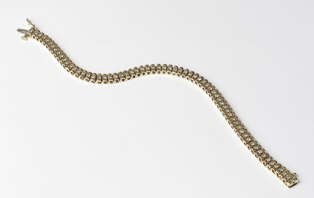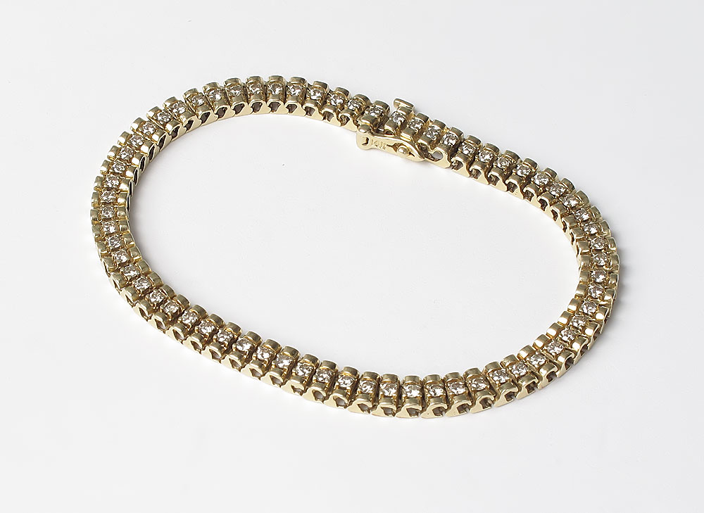 1.50 CTW DIAMOND TENNIS BRACELET: 14K yellow gold bracelet contains 65 round full cut diamonds. Weight: 1.50 Ct. Approx. The diamonds average SI in clarity and H-I in color. The diamonds are prong set. Locking closure with figure eight safety clasp. Weight: 14.0 grams. Length: 7''.
