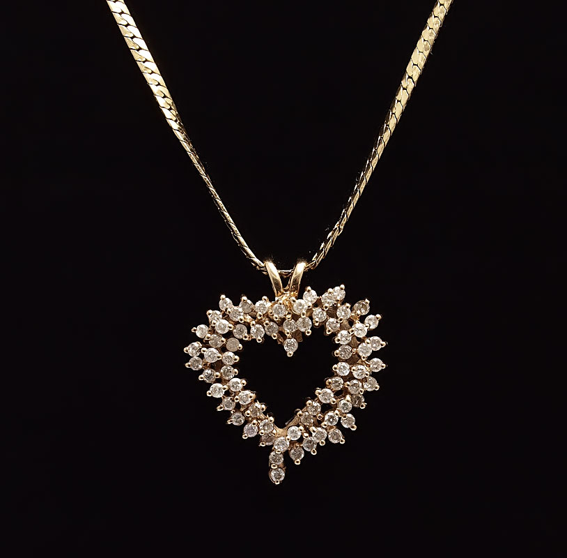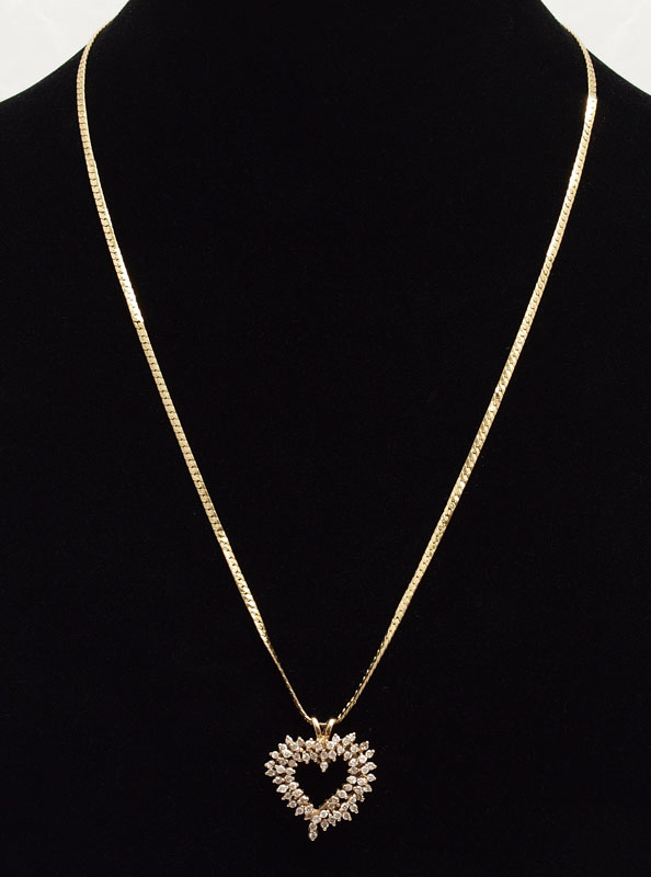 14K GOLD 1.00 CTW DIAMOND HEART PENDANT: 14K yellow gold pendant contains 66 round full cut diamonds. WEIGHT: 1.00 Ct. Approx. Rated I1 in clarity and I-J in color. The diamonds are prong set. 14K yellow gold 16'' herringbone chain with some kinks. Weight: 8.8 grams.