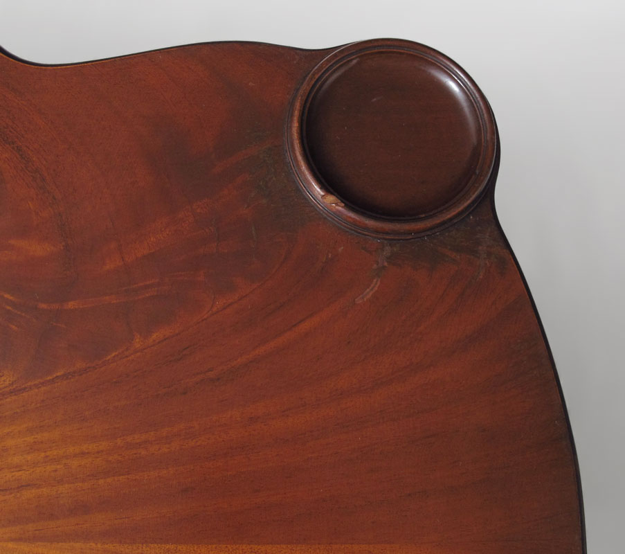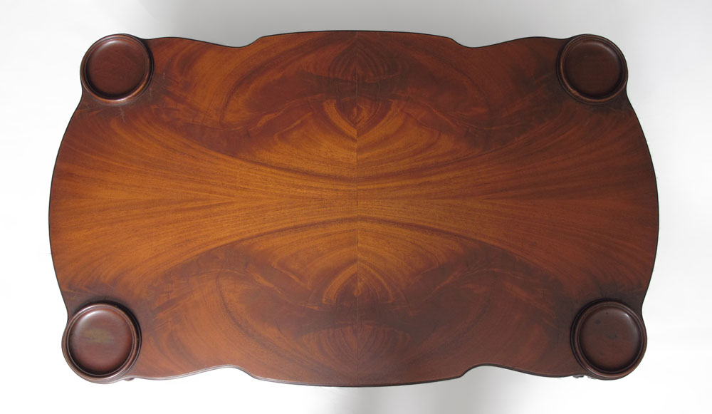 MAHOGANY BALL AND CLAW FOOT COFFEE TABLE: Shaped crotch grain veneer top over carved cabriole legs ending in ball and claw feet. Fitted glass top. Approx. 18'' tall x 38'' x 21''.